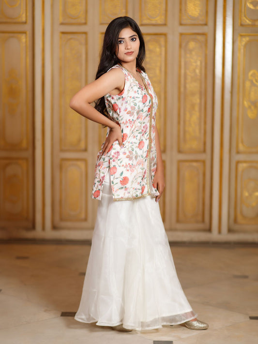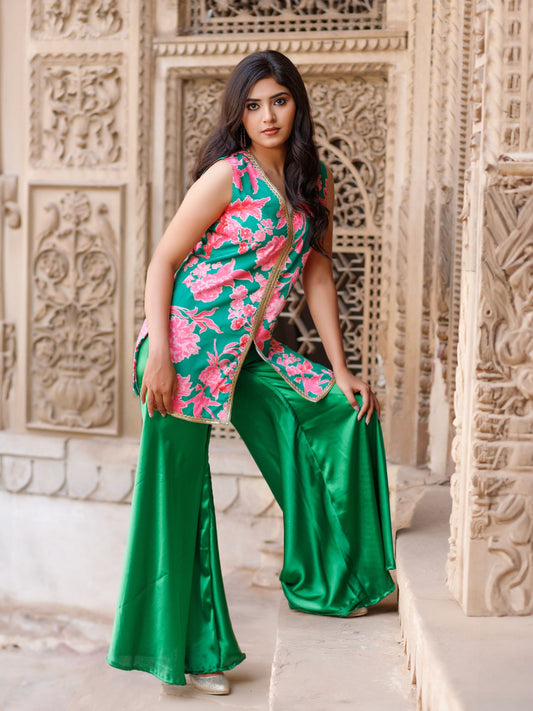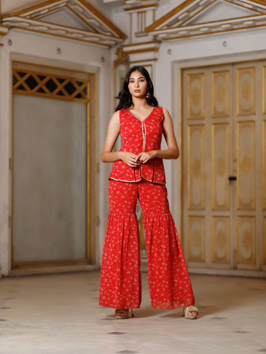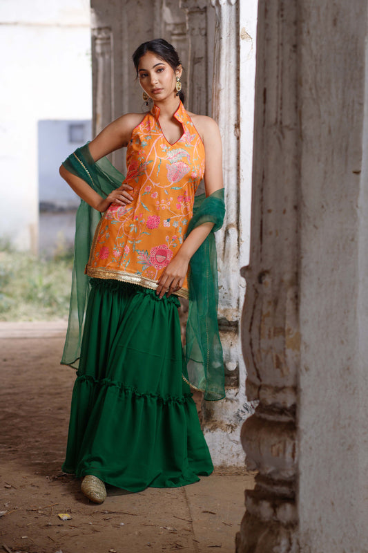 Chintz Floral Printed Halter Neck Kurta with Tiered Sharara Set