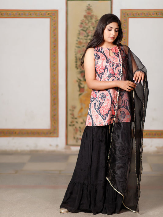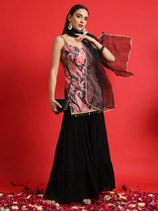Paisley Printed Embellished Strappy Kurta and Sharara Set