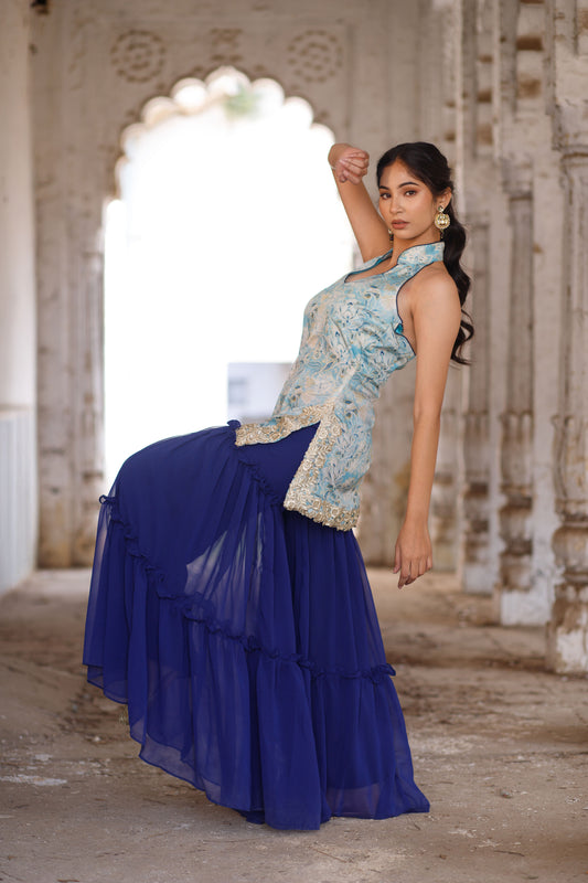 Blue Floral Printed Halter Neck Kurta with Tiered Sharara Set
