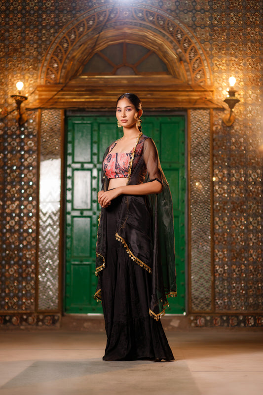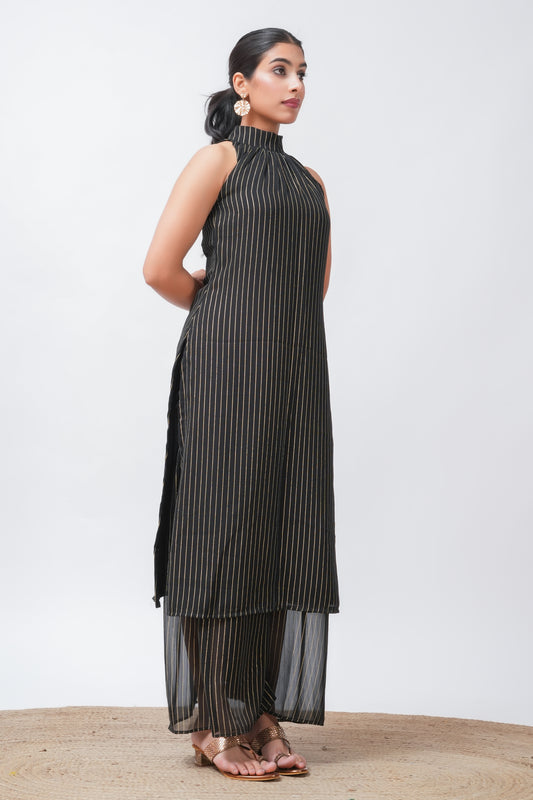 Black Georgette Lurex Halter Neck Kurta with Sharara