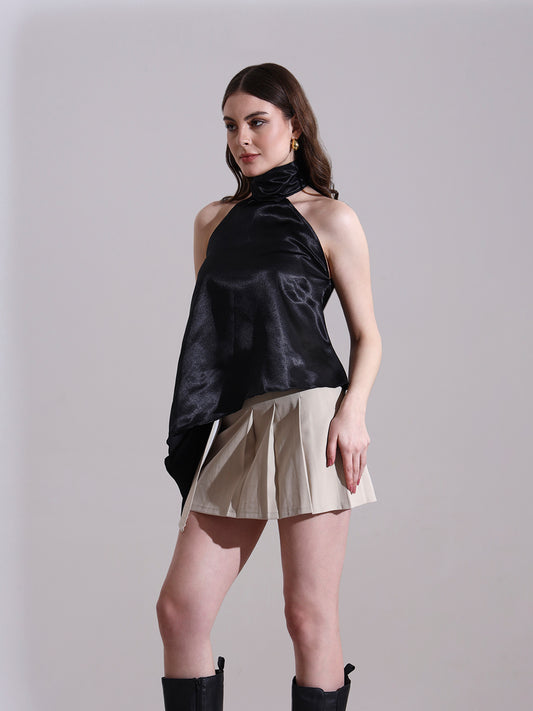 Black Satin Asymmetric Halter Neck Top