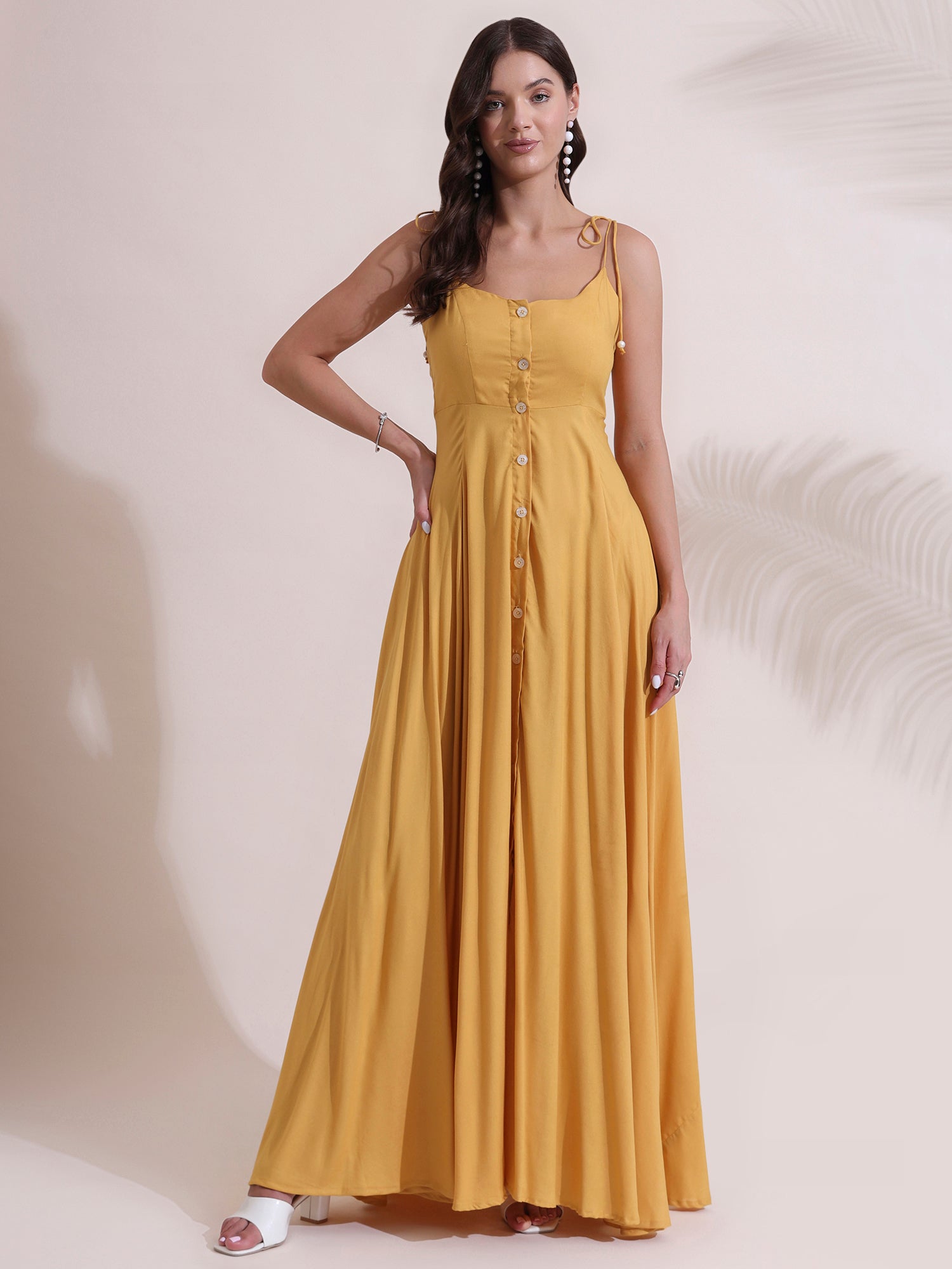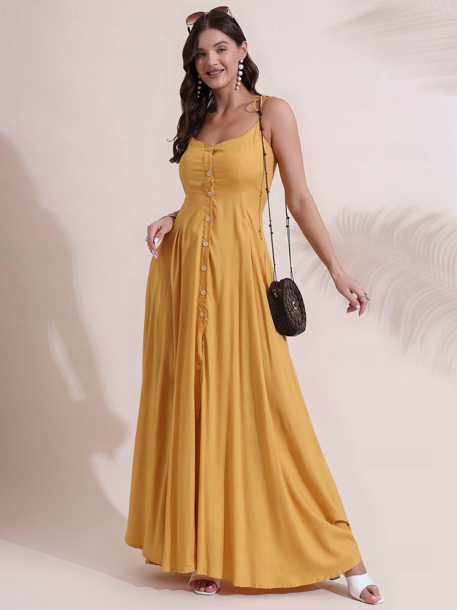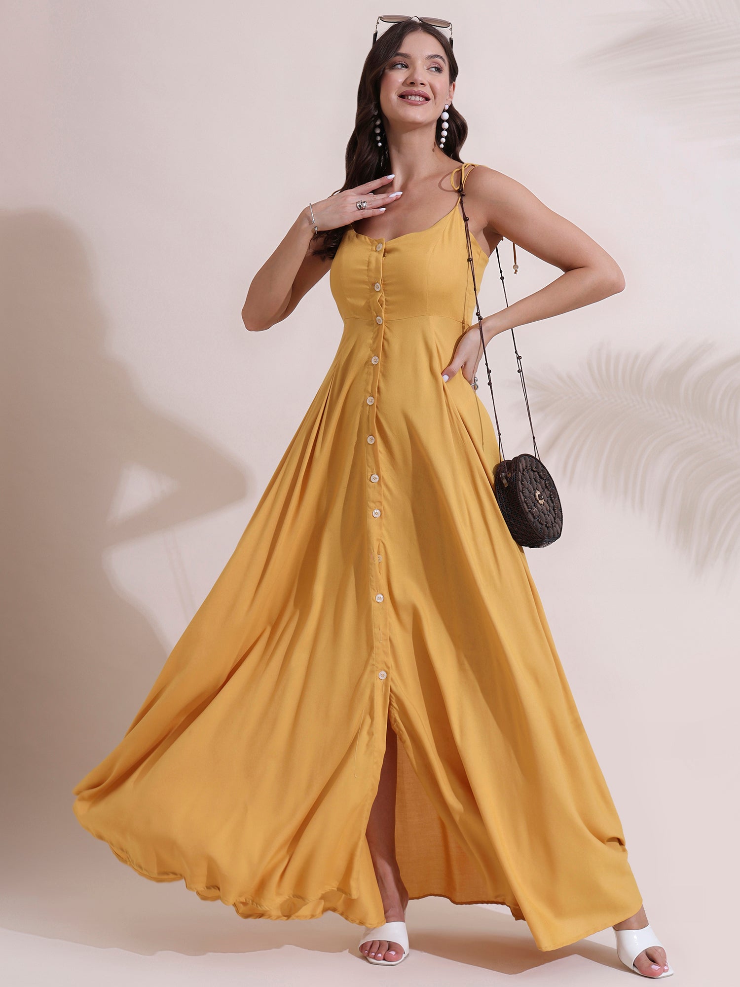 Made from lightweight, breathable rayon, this dress is designed to keep you cool and comfortable while delivering graceful movement and flow. The adjustable shoulder tie straps add a playful, feminine touch and allow for a customizable fit, while the button-down front lends vintage-inspired detail and easy wearability. Flowing down to a full-length maxi silhouette, it flatters all body types and creates a relaxed yet refined look.