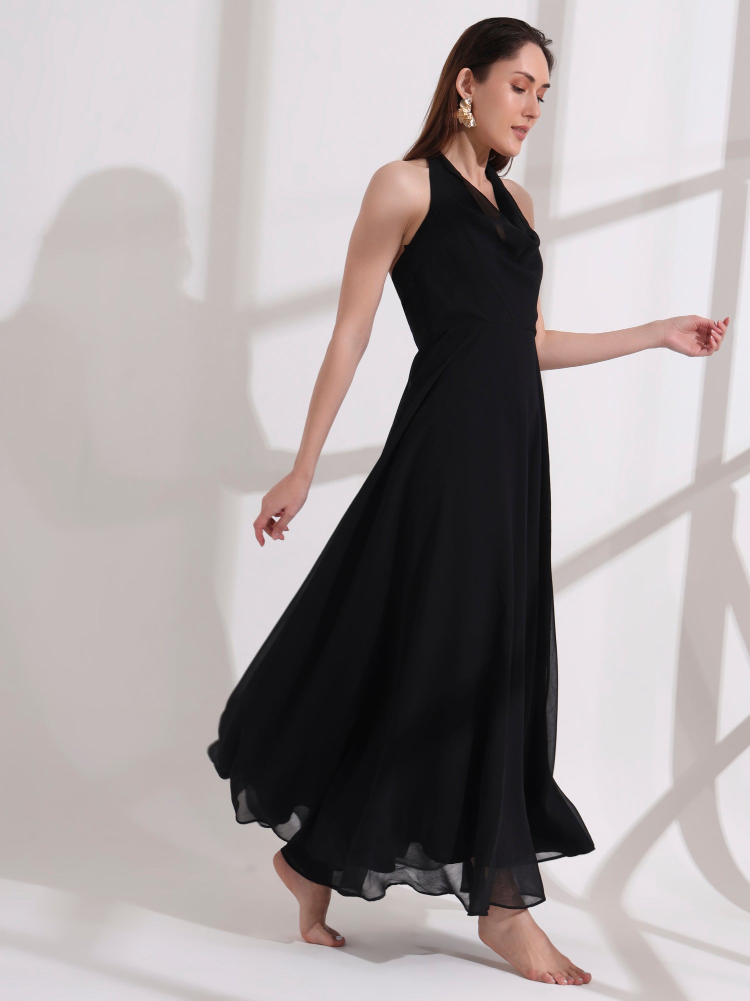 This cowl neck maxi dress with a belt is a perfect blend of elegance and sophistication. The flowy georgette gabric enhances movement, while the cowl neck adds a soft, draped effect for a graceful touch. Ideal for evening gatherings, or special occasions, this dress excudes effortless charm.