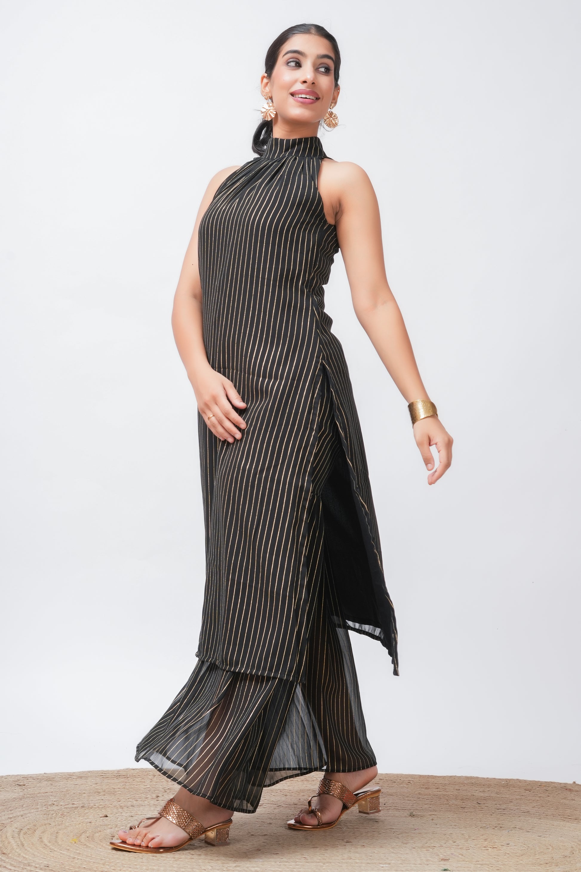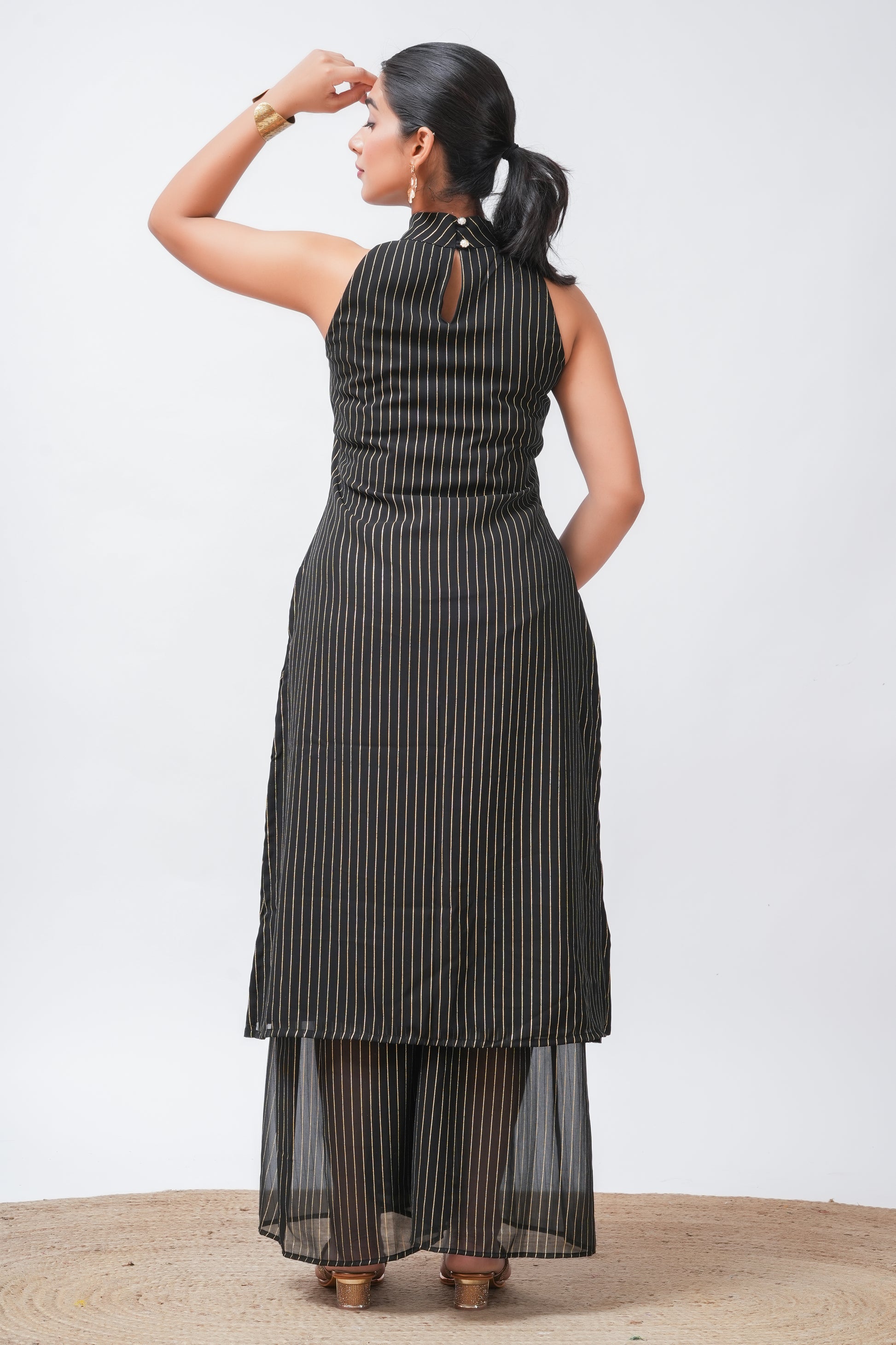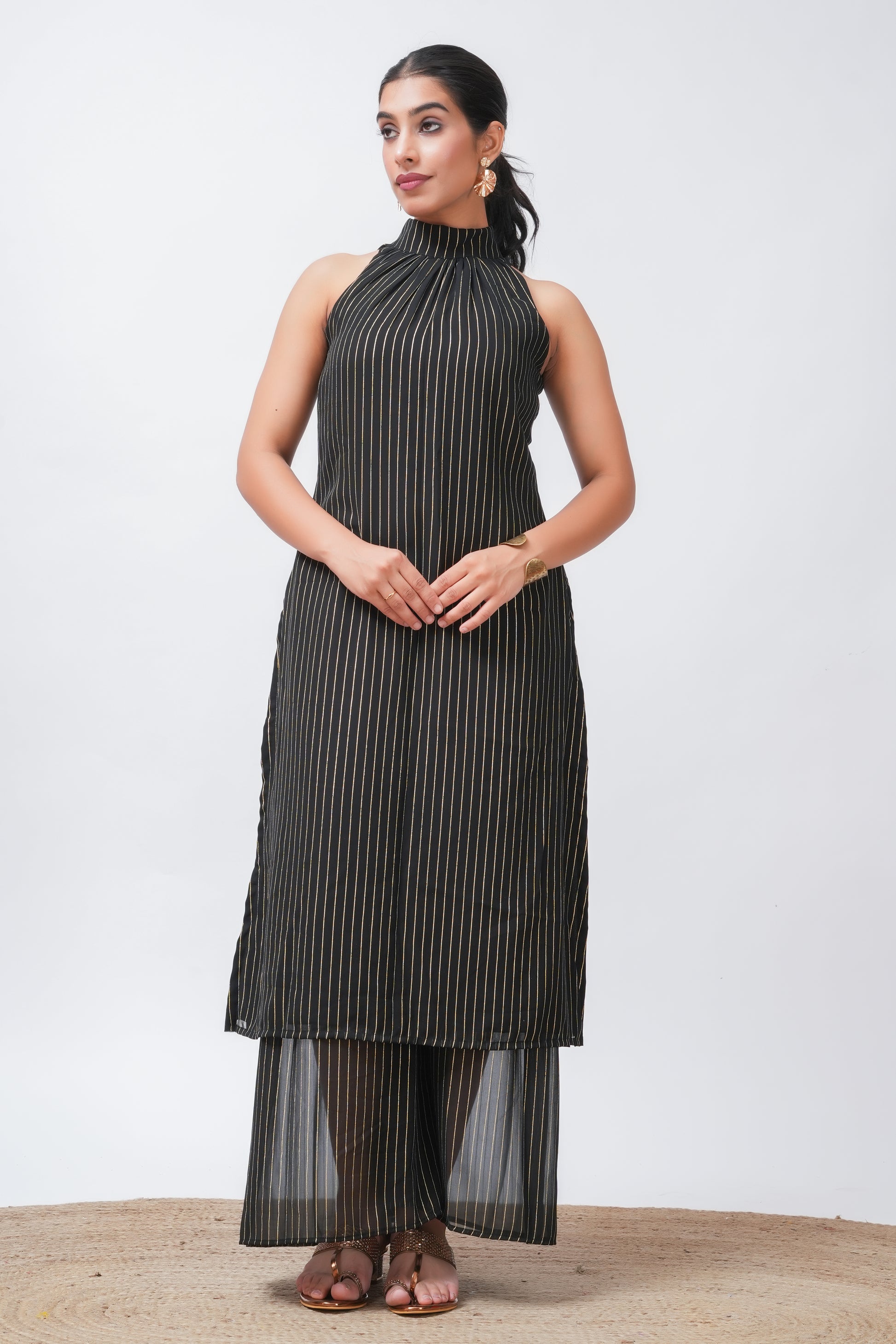 Black Georgette Lurex Halter Neck Kurta with Sharara
