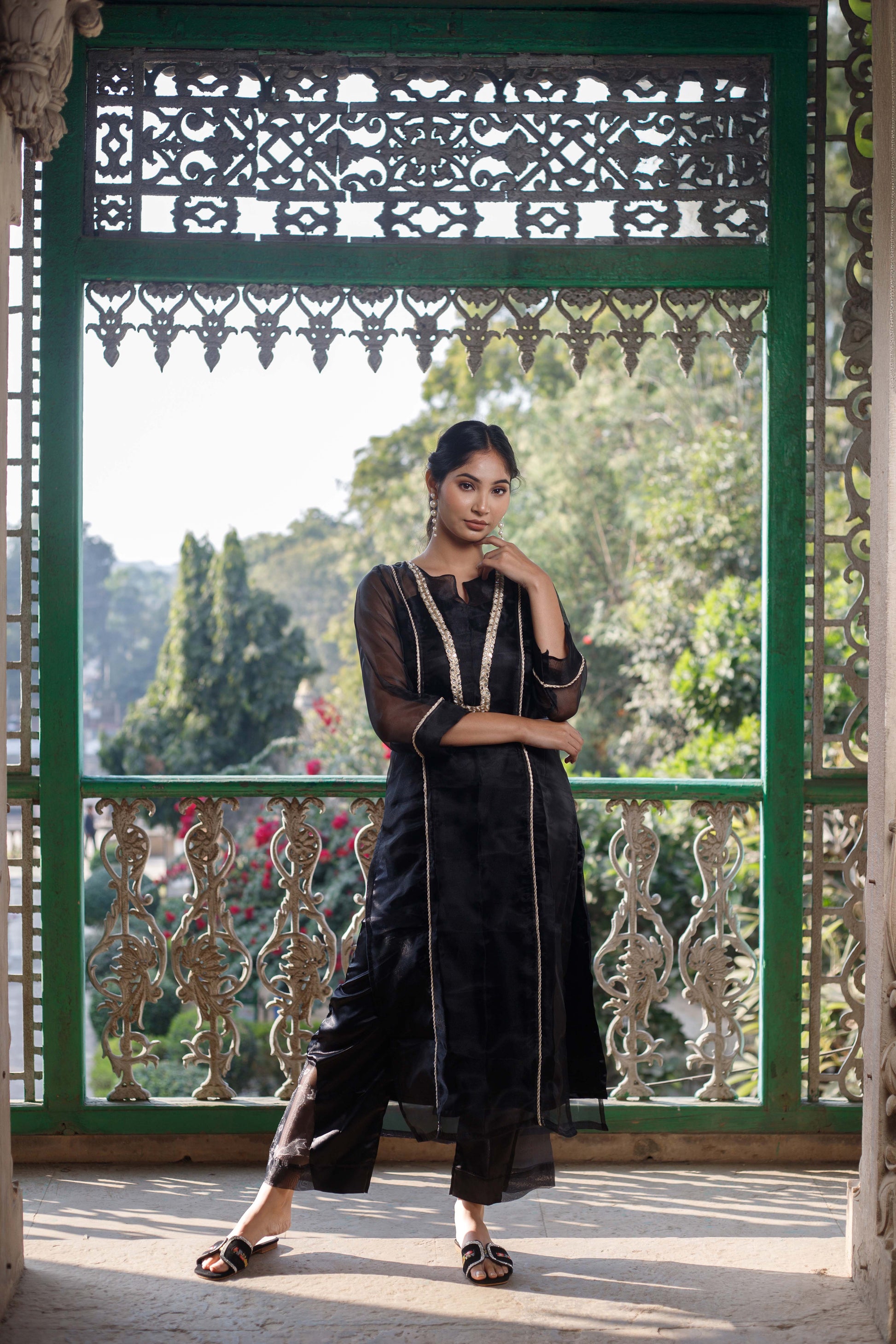 Embrace elegance with this exquisite organza and satin embellished kurta set. The kurta is crafted from sheer organza, adorned with embellishments that add a touch a sophistication. Paired with satin underneath kurta and trousers, the ensemble exudes luxury and grace, making it perfect for festive occasions, weddings, or evening events.