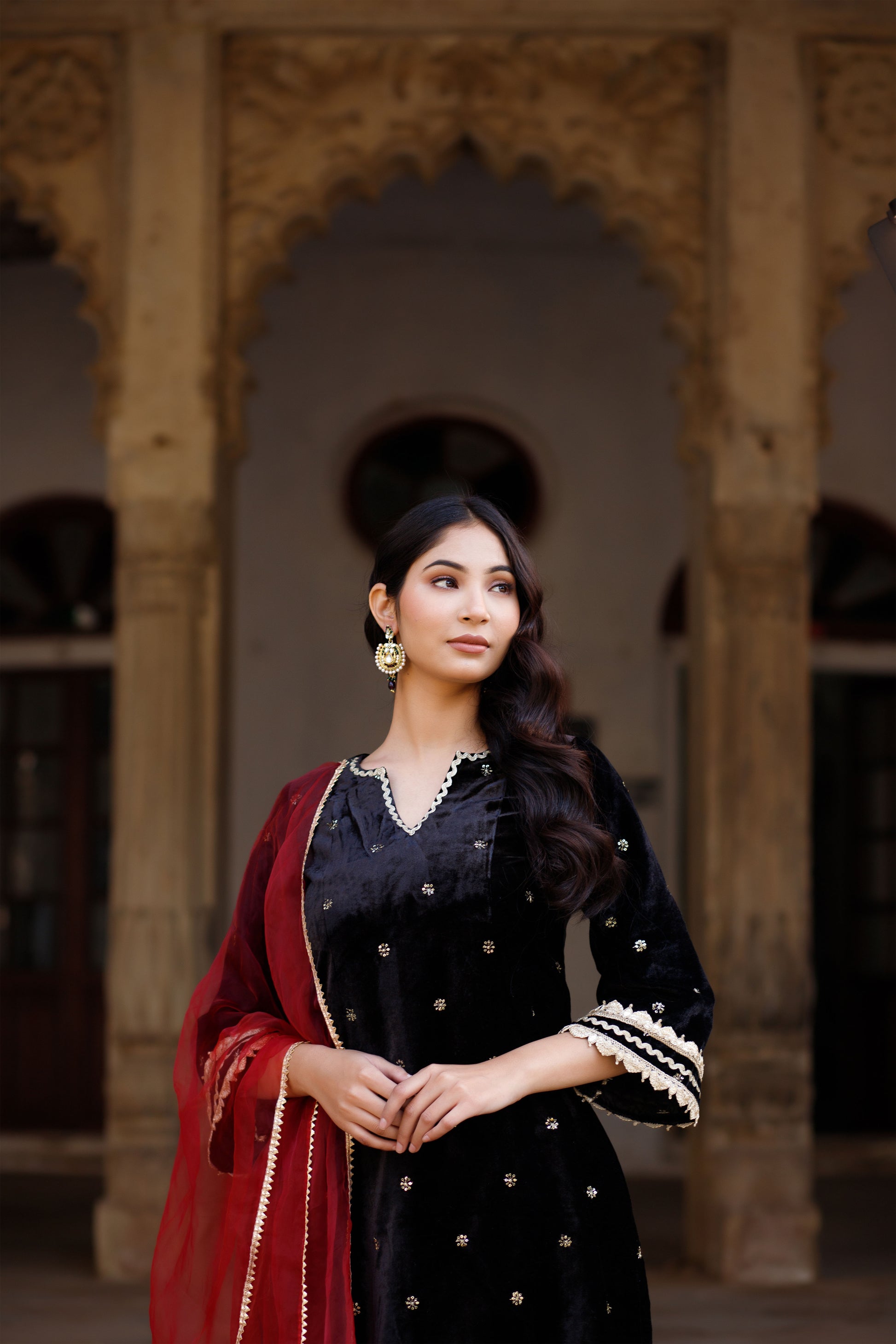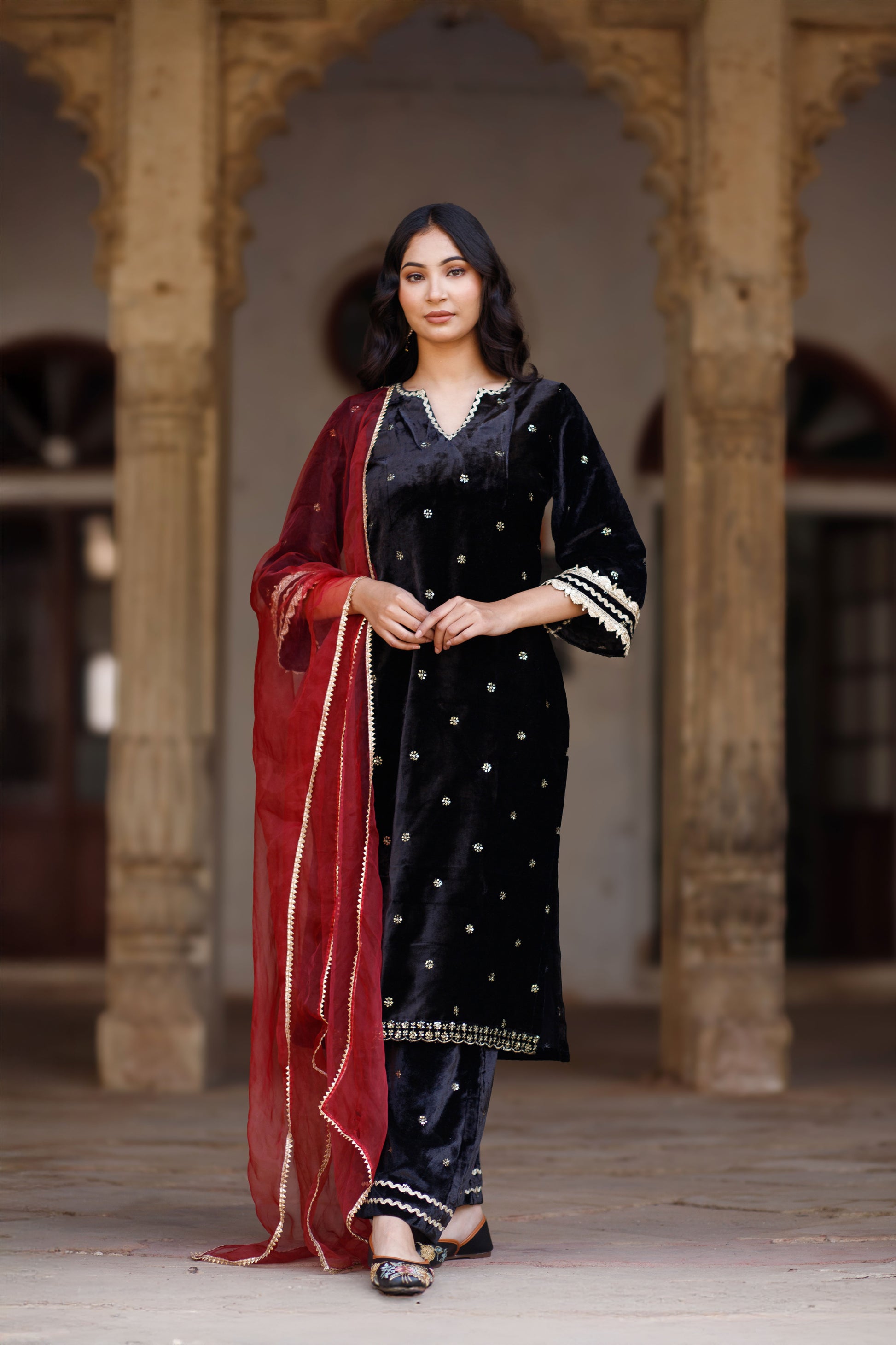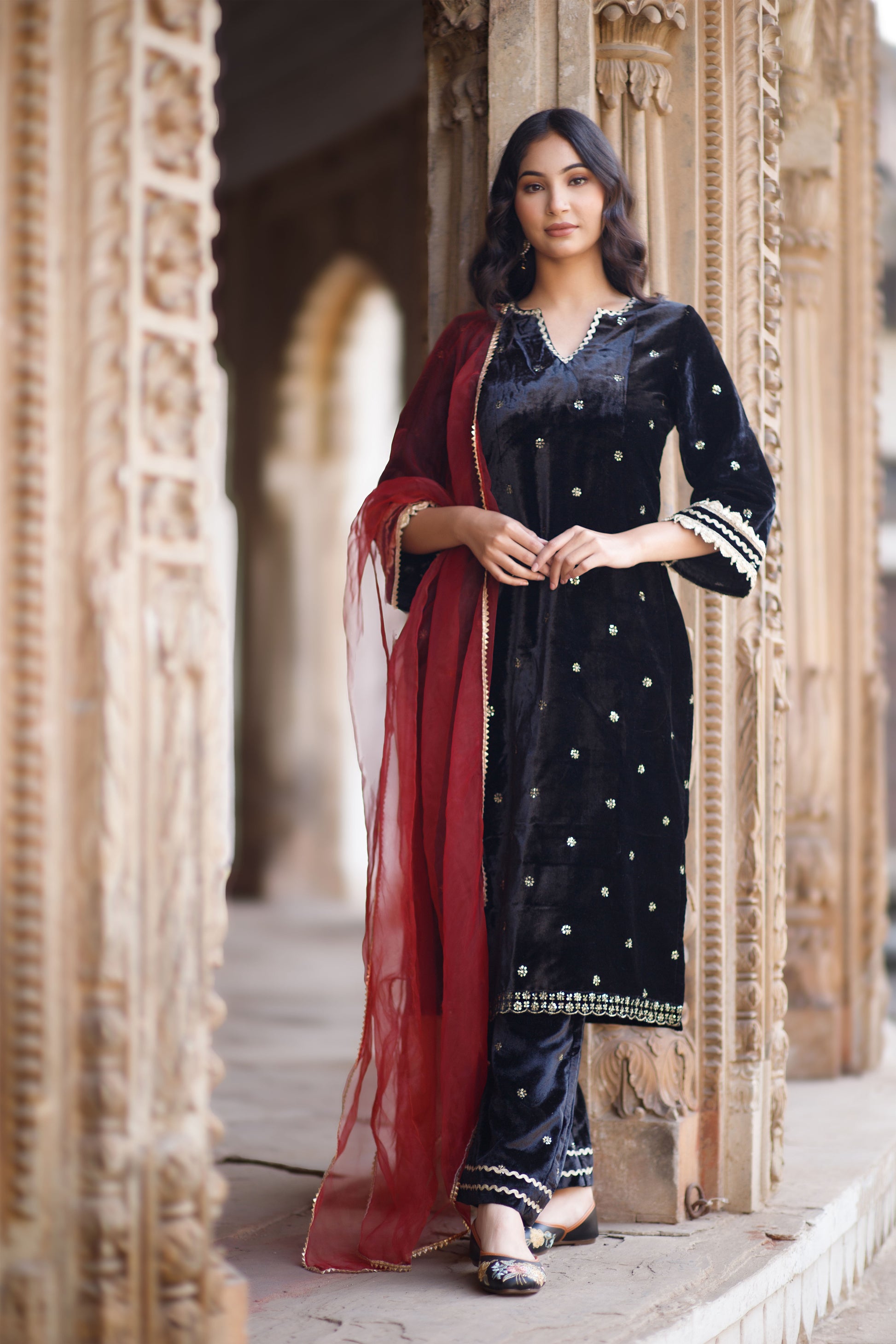 Elevate your festive wardrobe with this luxurious velvet embellished kurta set. The ensemble includes a matching pair of trousers and a contrasting dupatta, each designed to complement the kurta's ornate detailing.