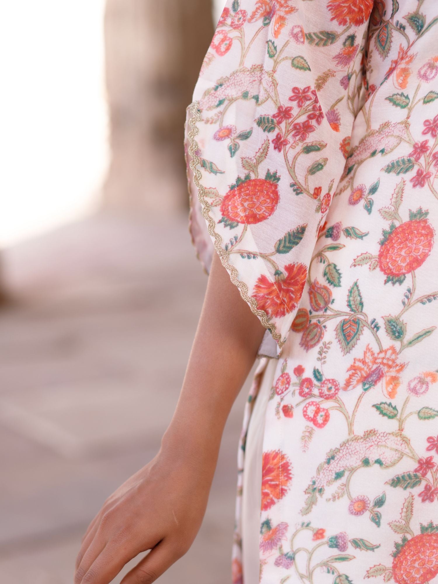 Our Chintz Floral print takes form in this kurta. It is adorned with shimmering metallic scalloped lace-work on the Sleeves.