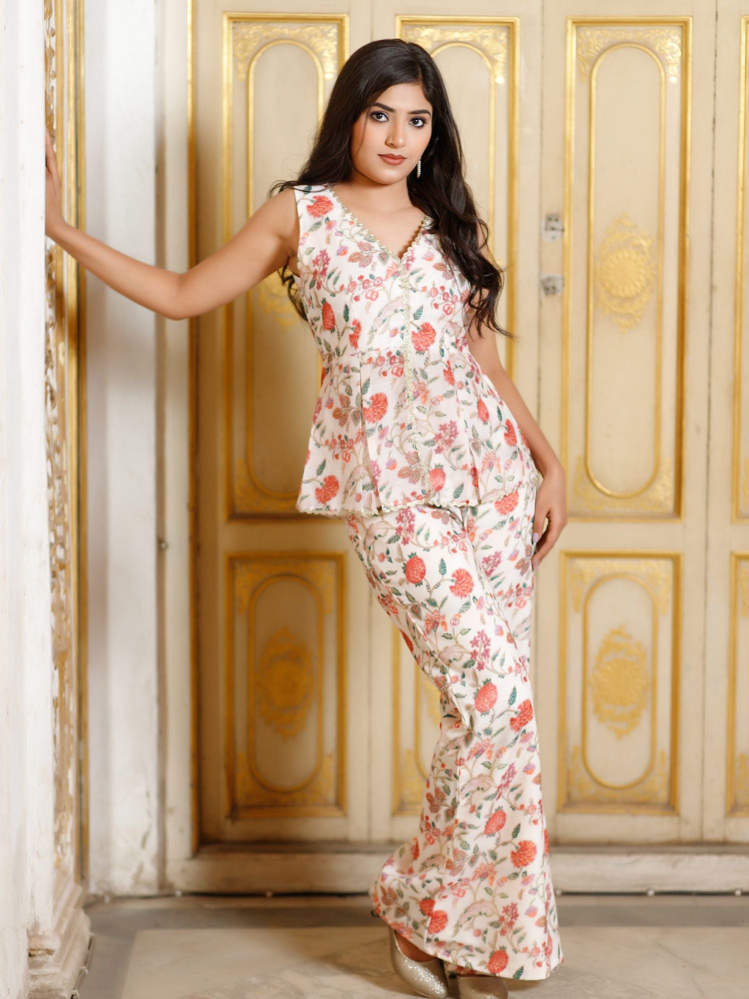 Our Chintz floral printed Peplum with wide legged pant set is both easy and festive. The Peplum top is set in our newly launched Chintz floral print. The Peplum top is paired with matching wide legged pants to complete the look.