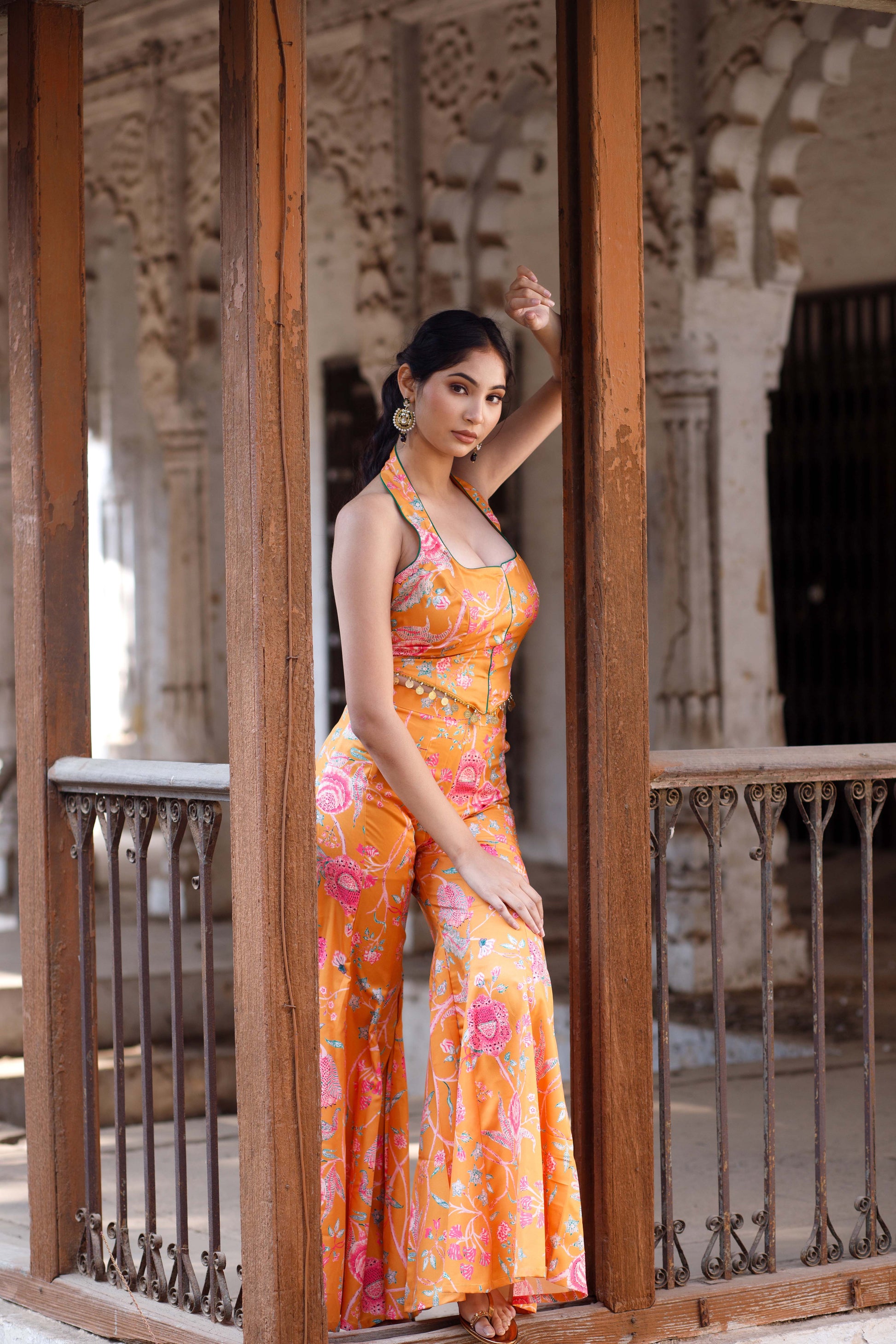 Turn heads with this stunning printed halter neck corset paired with a flowing sharara set. The corset features a flattering halter neckline and vibrant prints, accentuating your silhouette while offering a bold, modern look. Ideal for festive occasions, weddings, or special gatherings, this ensemble promises to make you the center of attention.