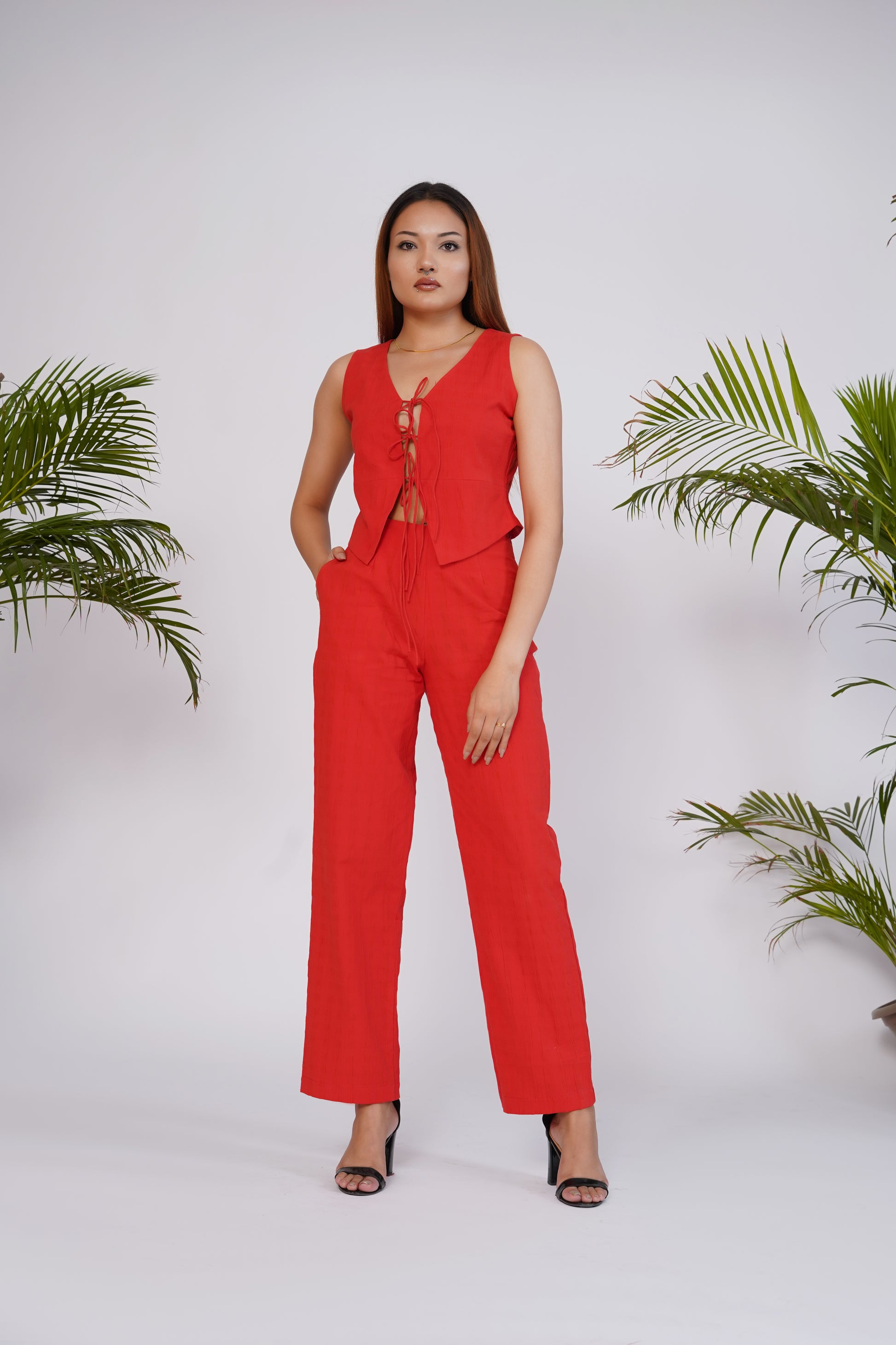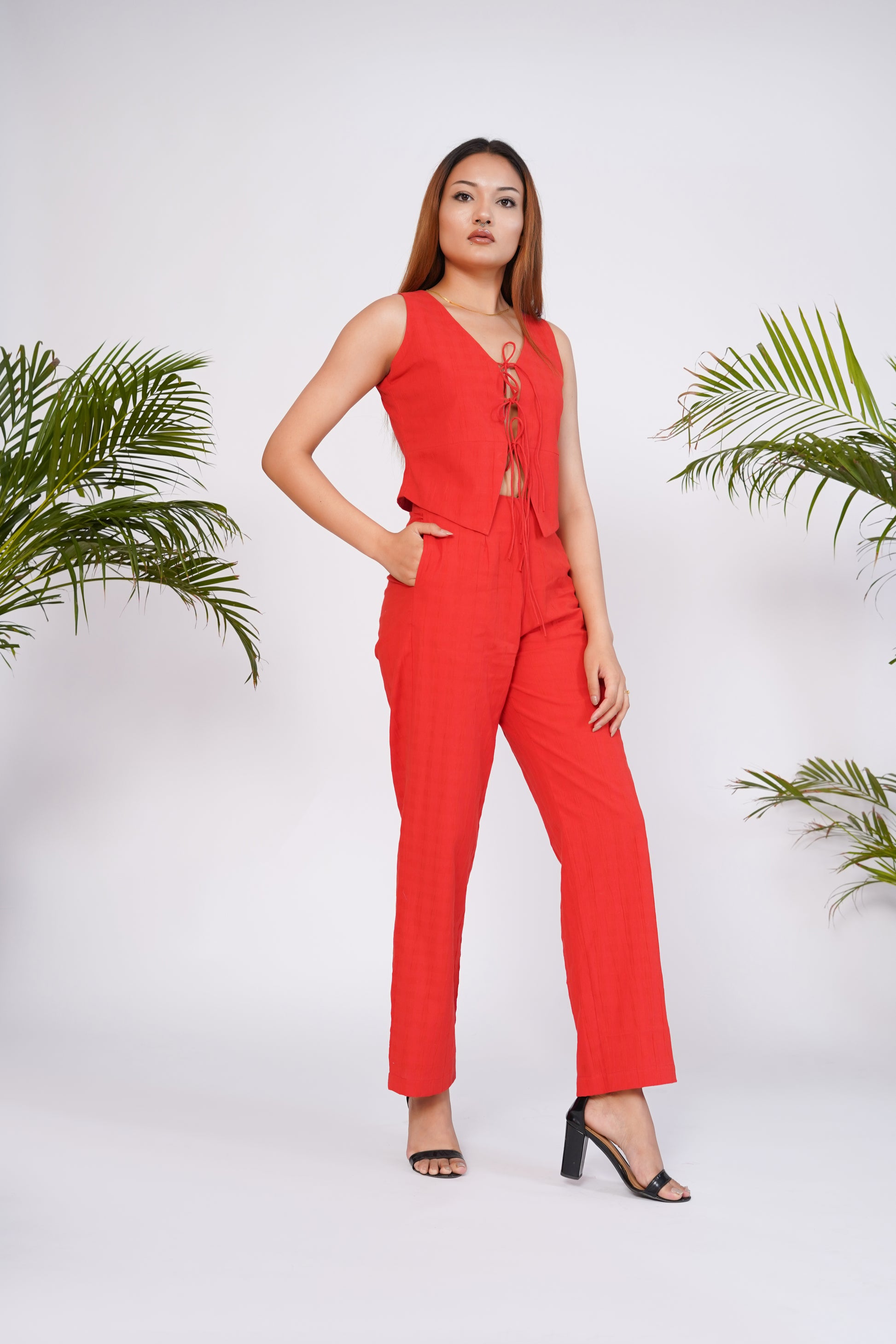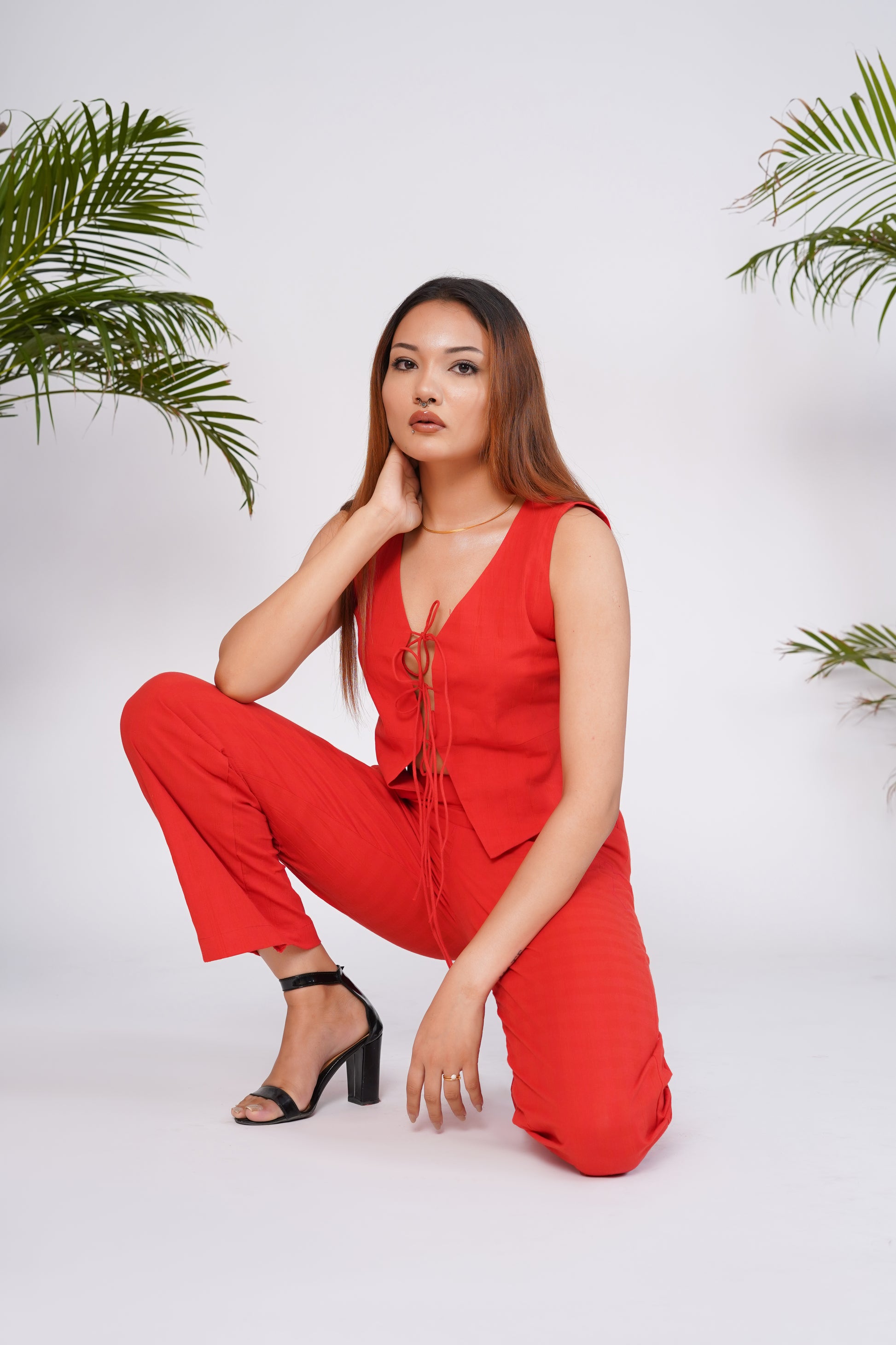 This women's summer front tie-up top and trouser set is the perfect combination of chic and breezy. The front tie-up detail adds a touch of style and adjustability, allowing you to create a flattering silhouette by cinching the waist. The top and straight fit trouser is ideal fit for a chic and effortless ensemble.