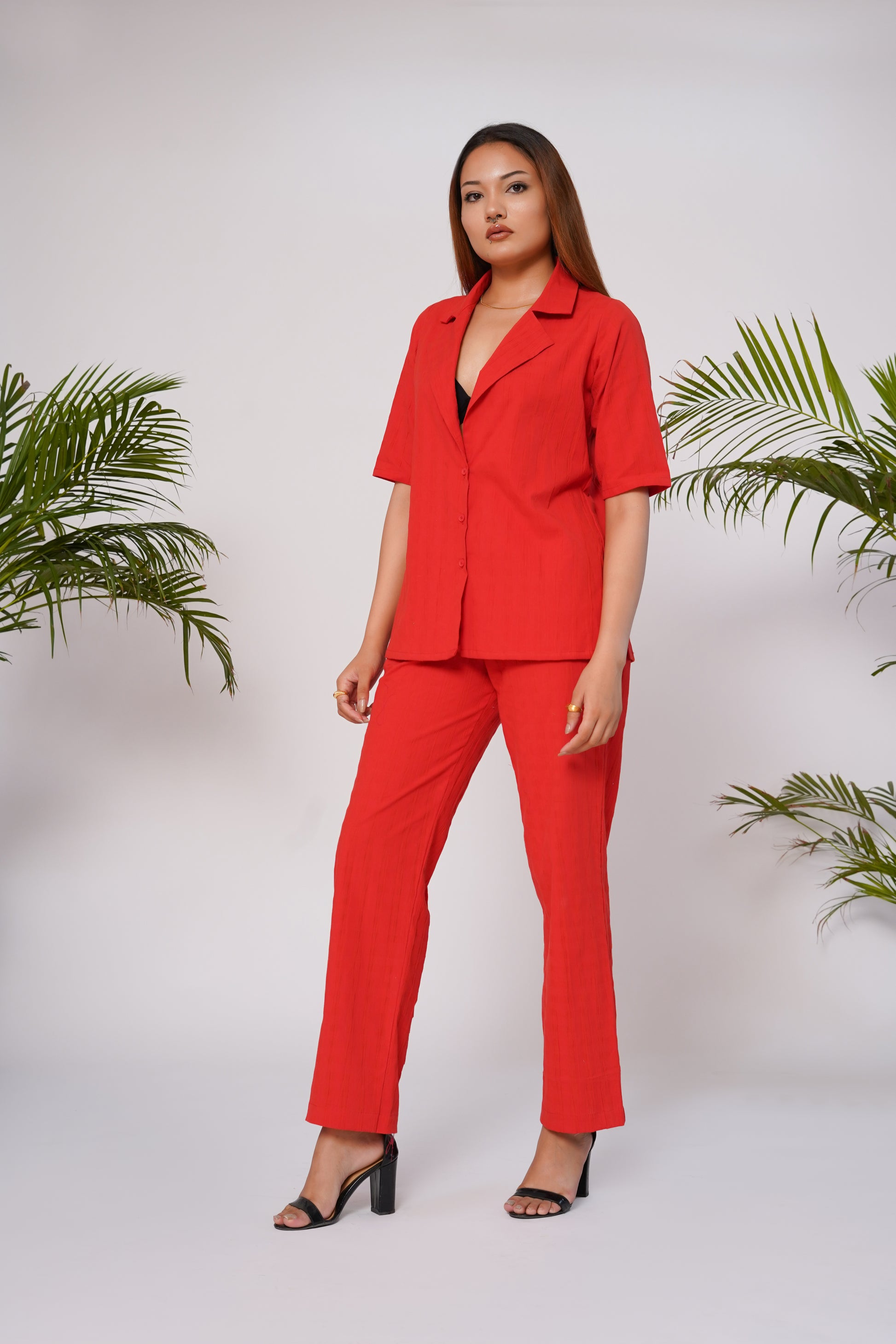 This women's summer lapel collared shirt and trouser set is the epitome of relaxed elegance. With its relaxed fit and versatile style, this shirt and straight fit trousers is ideal fit for a chic and effortless ensemble.