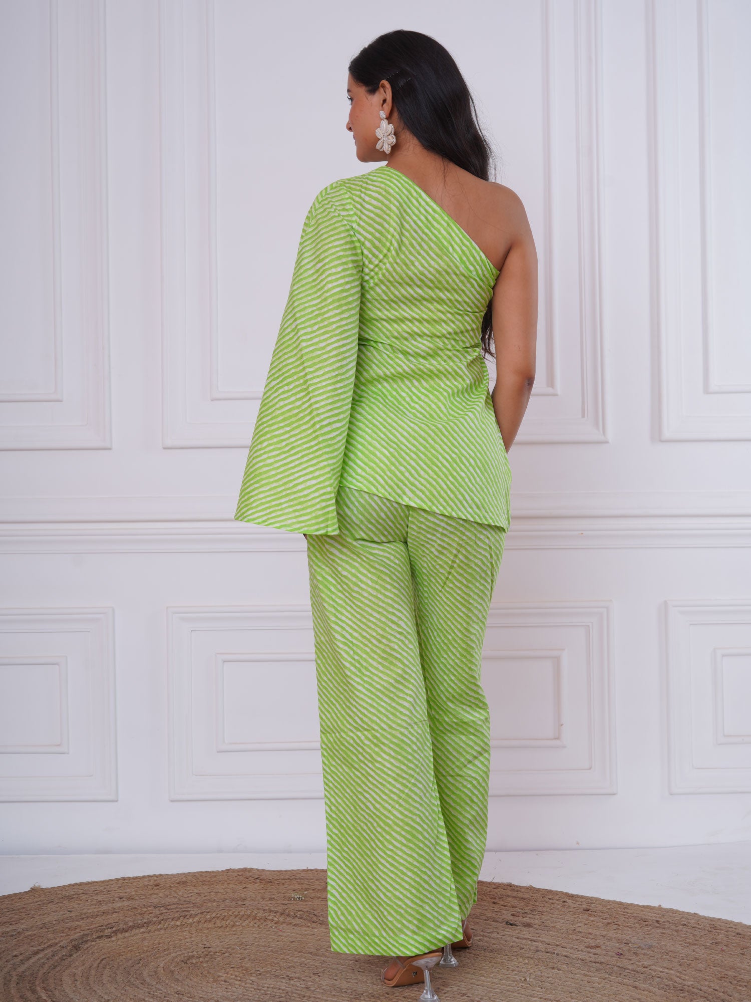 Our Green Leheriya One shoulder tunic is a perfect piece for various occasions like - Get together, casual meetings, brunch and semi-formal. The Printed one shoulder tunic has a beautiful slit at the sleeve. The Fabric is very soft and comfortable to wear. One could easily style it with it's matching Leheriya wide legged pants as well as style it other bottoms.