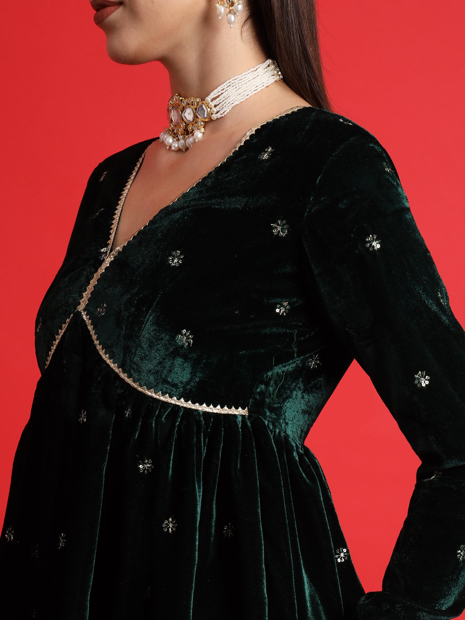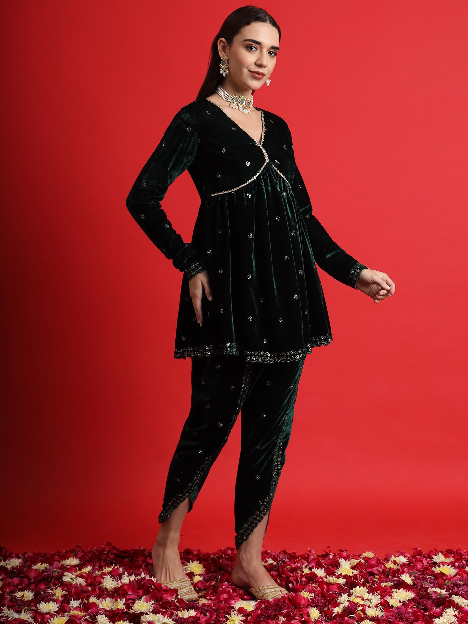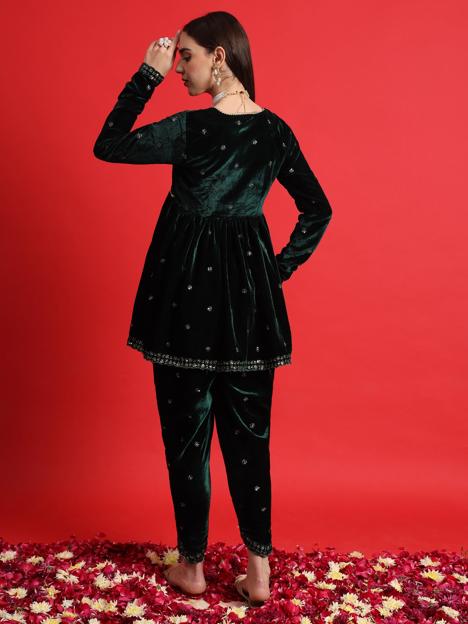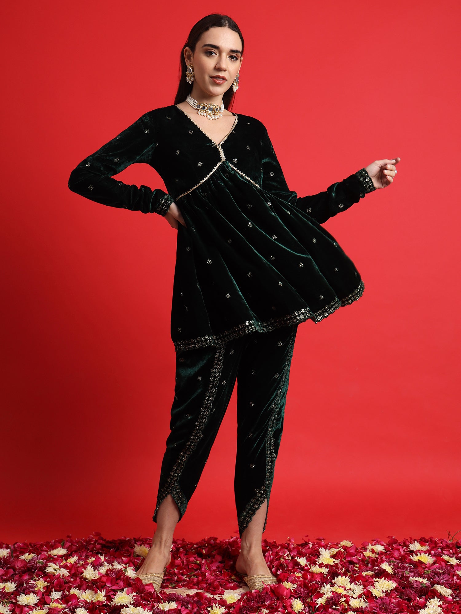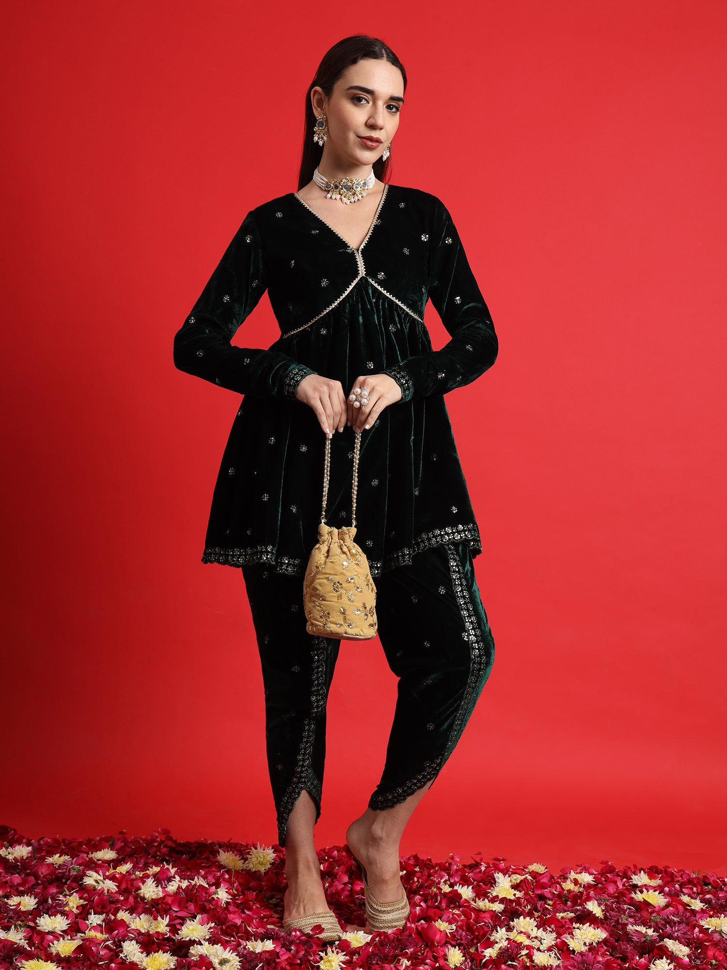 Set in our beautiful Velvet Embroidered, this kurta set is both easy and festive. The Embroidered kurta features a Empire neck and embellished lace-work. Stylish tulip pants to complete the look.