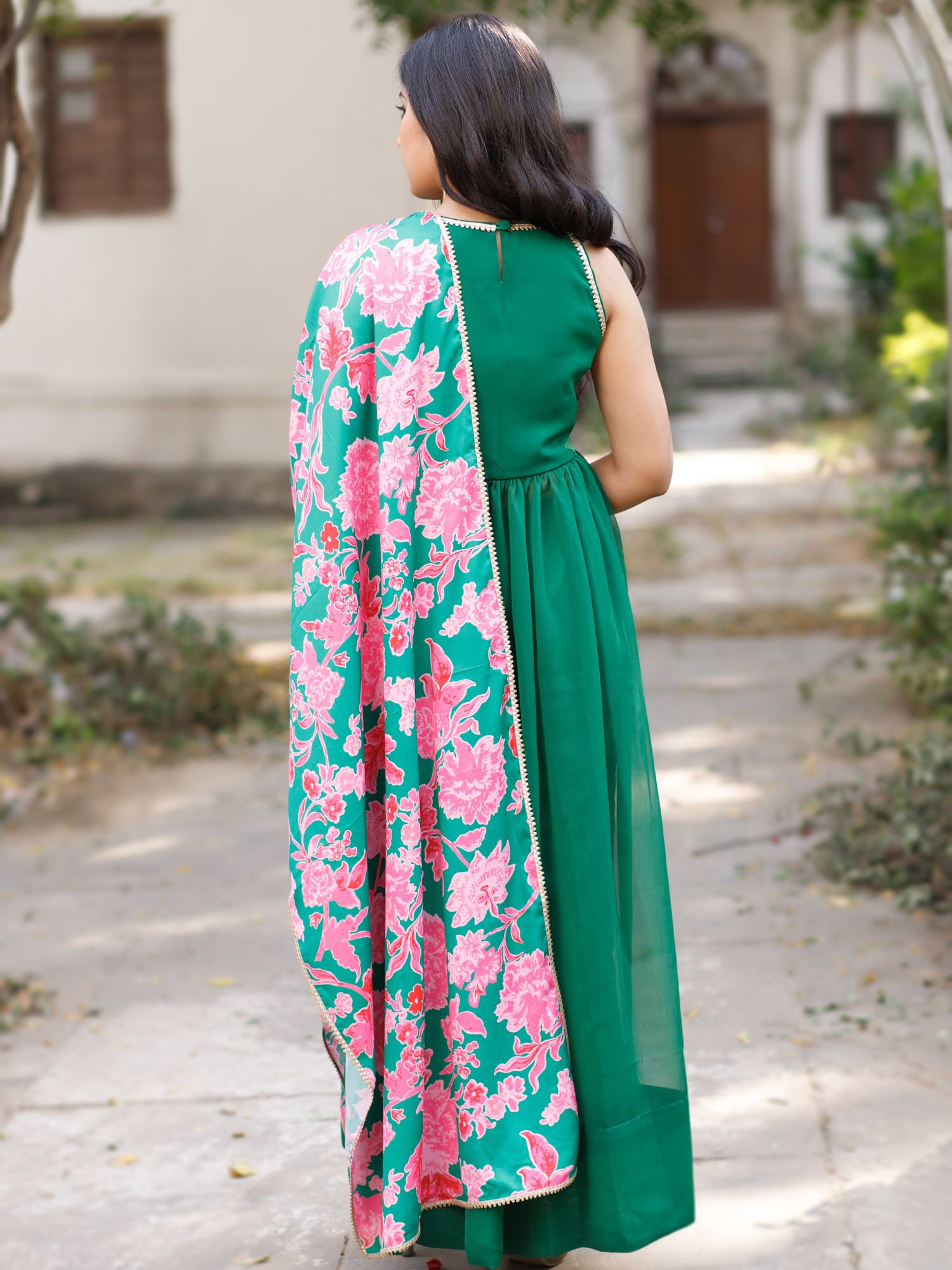 A must-have in our Green Floral print, Anarkali with halter neck design element. This anarkali set features lace-work on the neck and armhole area paired with plain crepe trousers and printed dupatta to complete the look.