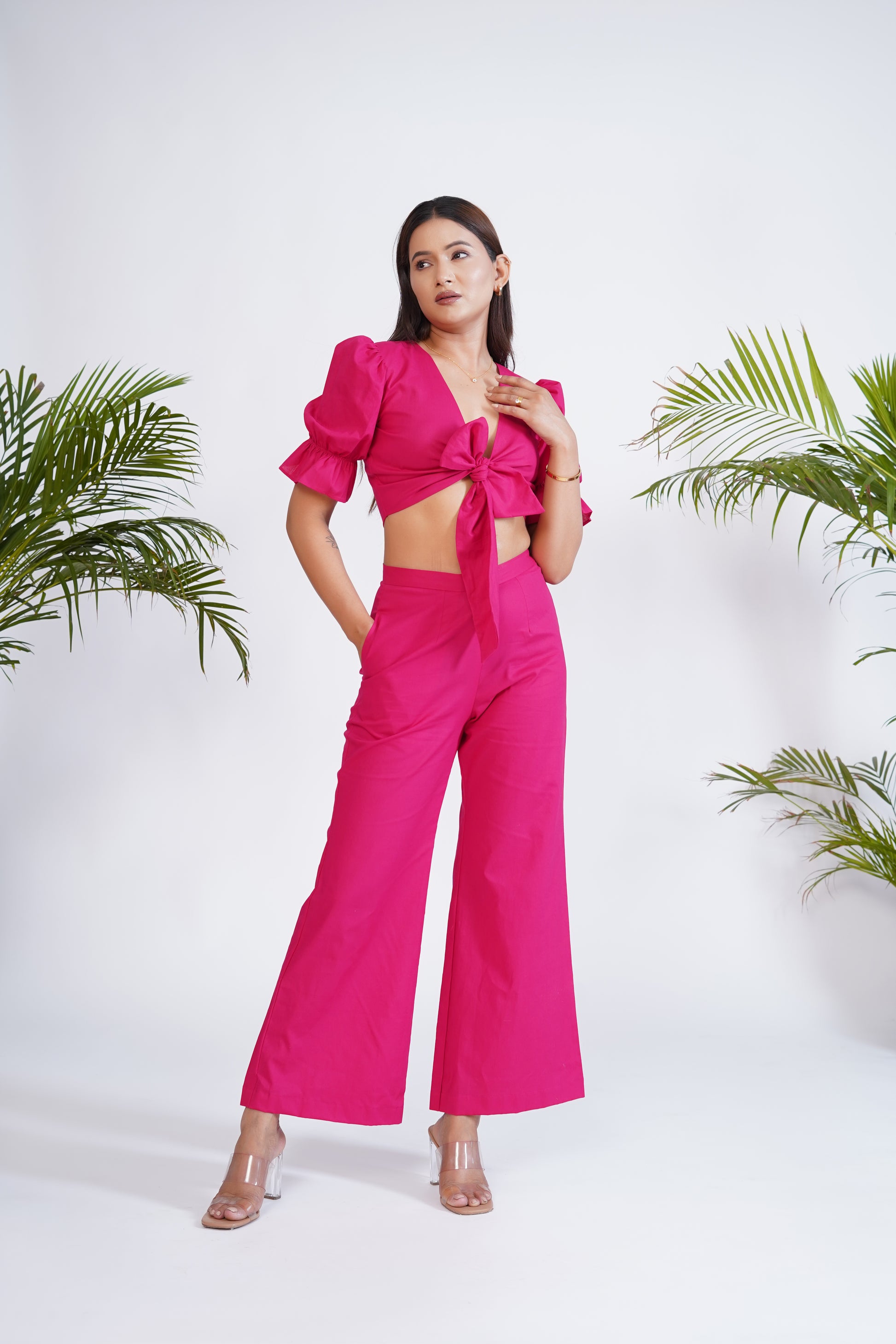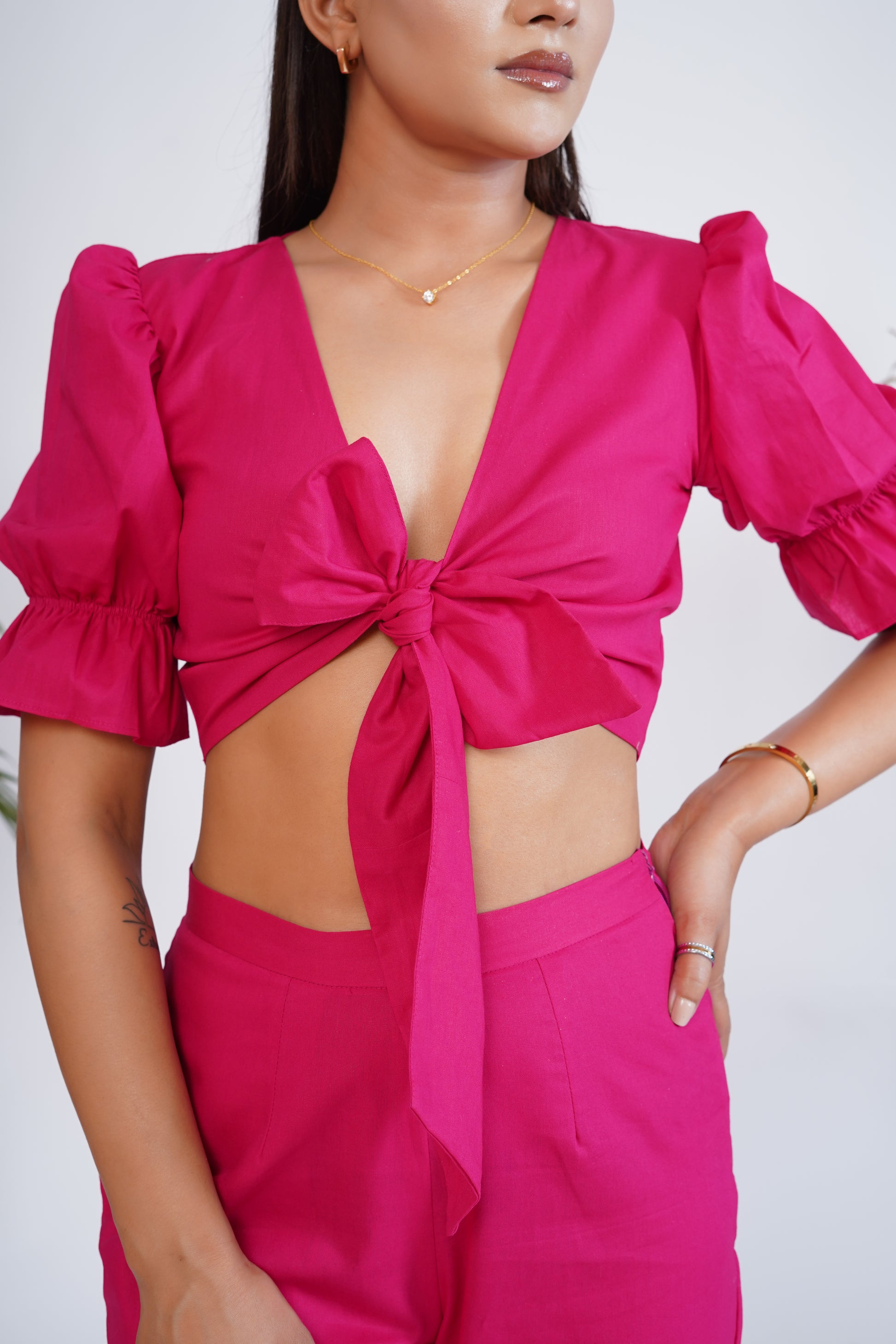Hot Pink front tie-up crop top and pant set