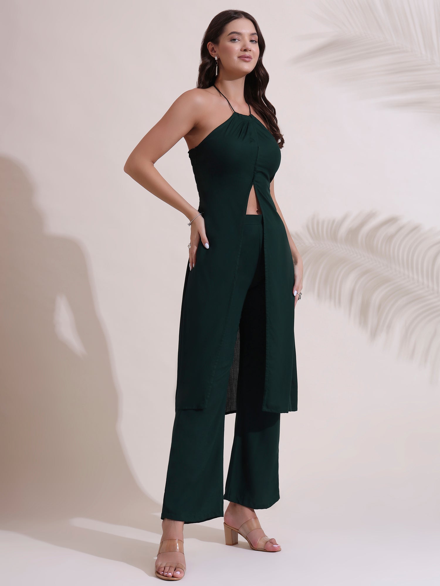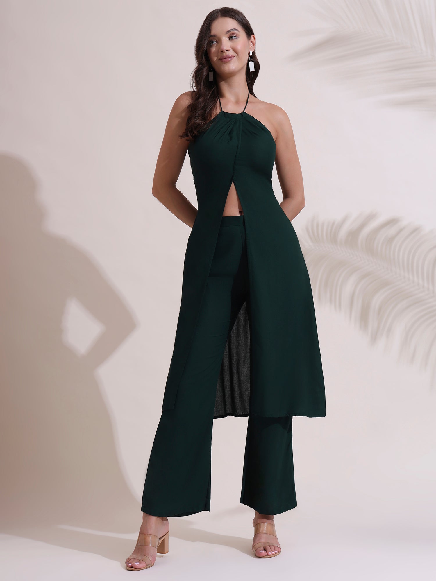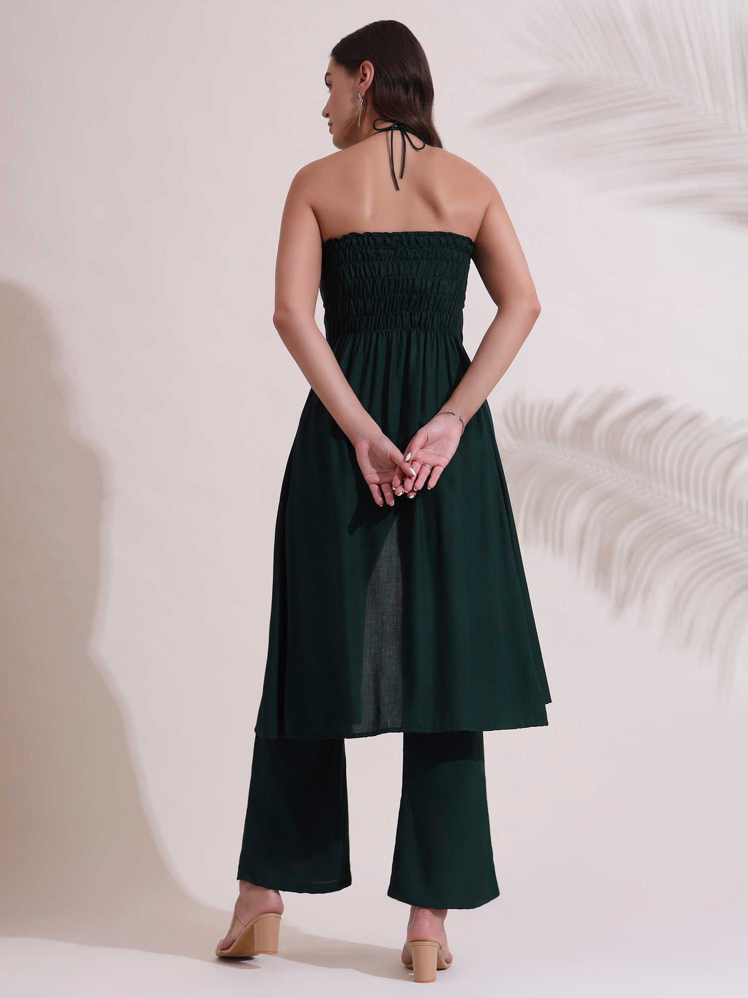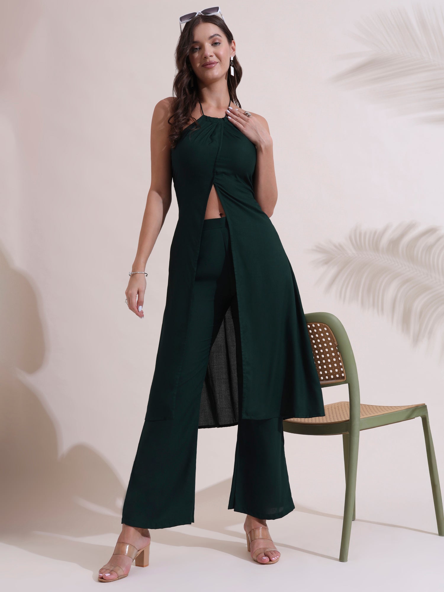 Make a bold yet graceful statement with this women's rayon sleeveless halter neck kurta set, designed for the modern woman who loves a touch of tradition with a twist. Crafted from soft, breathable rayon, the kurta features a sleek halter neckline and a striking front slit that adds movement and flair to the silhouette.