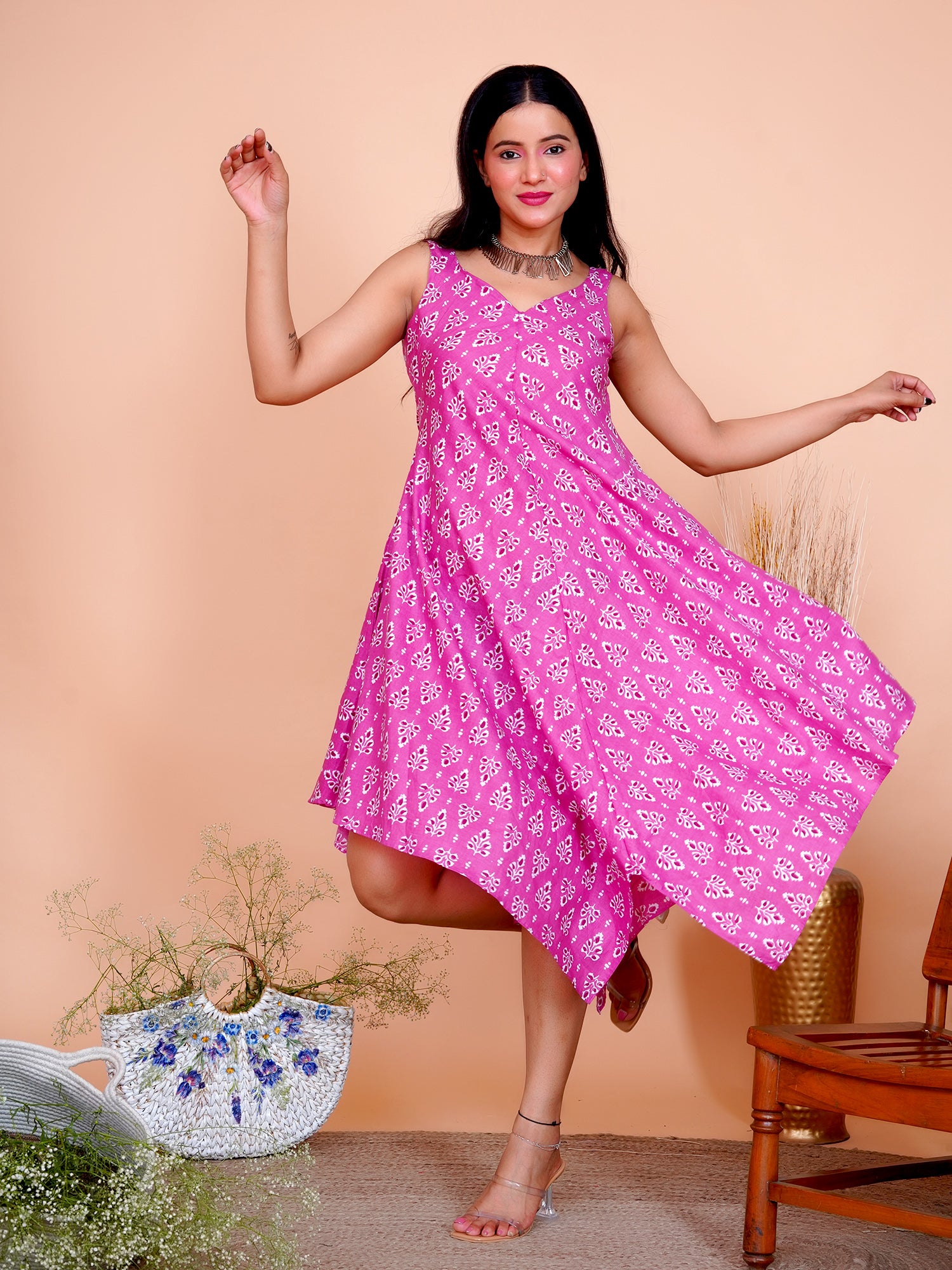 Our Cotton printed sleeveless mid-length dress combines the elegance of a dress with the comfort of cotton fabric. Its sleeveless design is perfect for warmer days and allows for ease of movement. The mid-length design flatters a wide range of body types. It strikes a balance between a shorter and longer dress, making it a go-to option for many women.