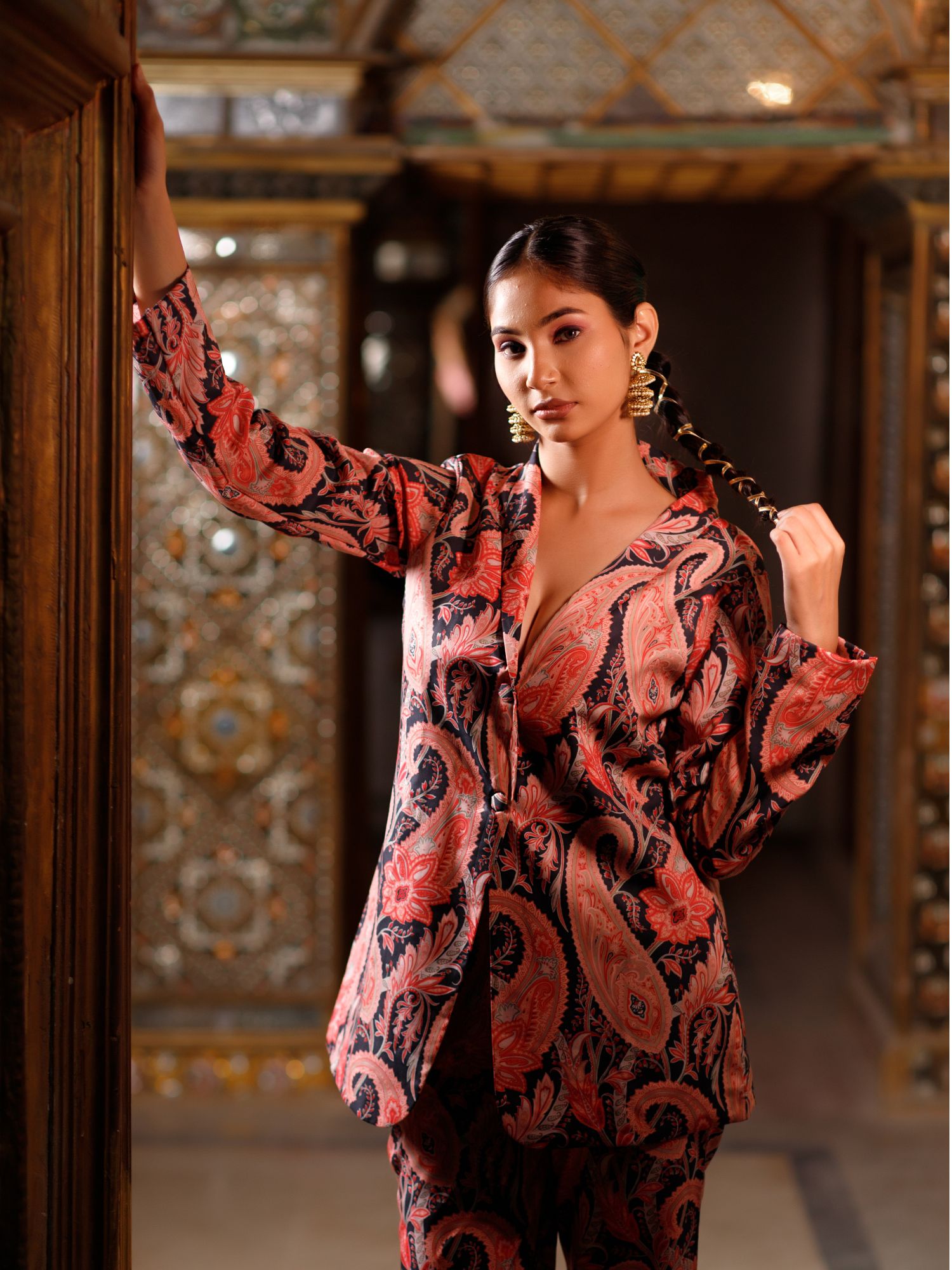 Think a Bold and Beautiful look in our Paisley printed blazer, tailored in Natural Silk Crepe. The blazer features front lapel colloared buttoned look. Take this cheery coordinated blazer from day to brunches to evening outings.