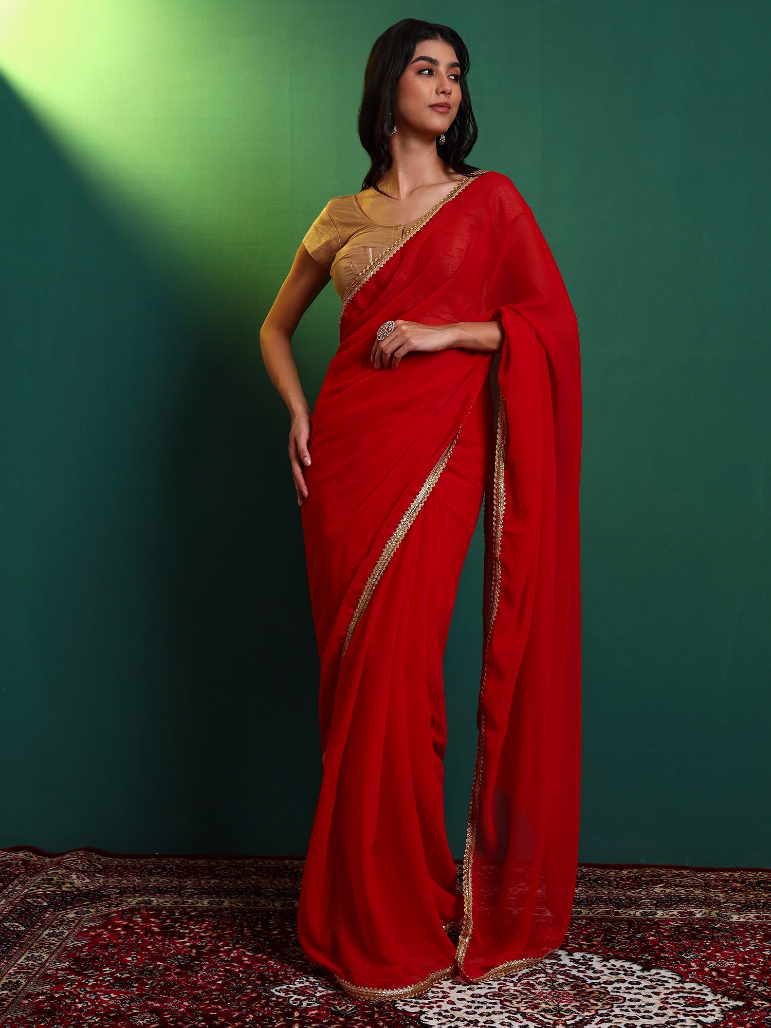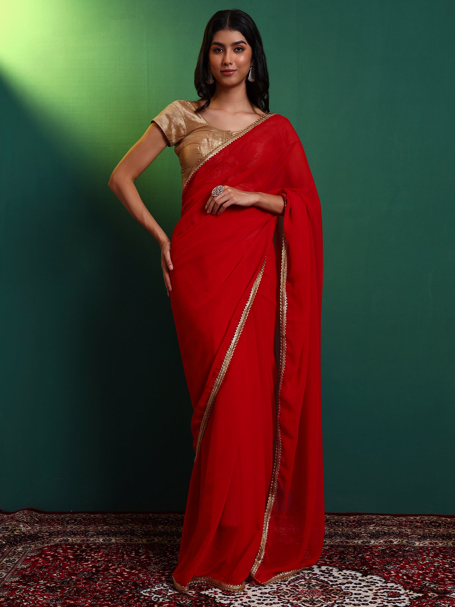 Turn heads with timeless elegance in this women's embellished Red classic saree, a perfect blend of tradition and glamour. Crafted from high-quality fabric, the saree features a rich red hue symbolizing grace and celebration. Intricately embellished with beautiful lace detailing, it adds just the right amount of sparkle for festive occasions, weddings, or special events.