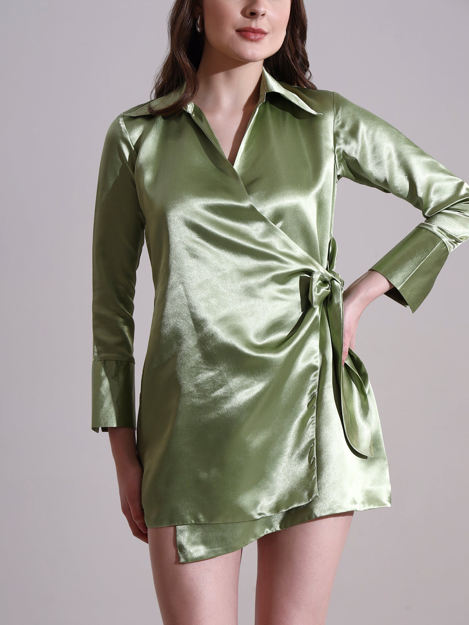 A satin side tie-up mini dress features a smooth, lustrous satin finish with a chic mini length. The side tie-up detail adds a stylish and adjustable element that enhances the silhouette while creating a flattering drape. Perfect for parties or evening outings, it offers a sleek, playful, and elegant look.