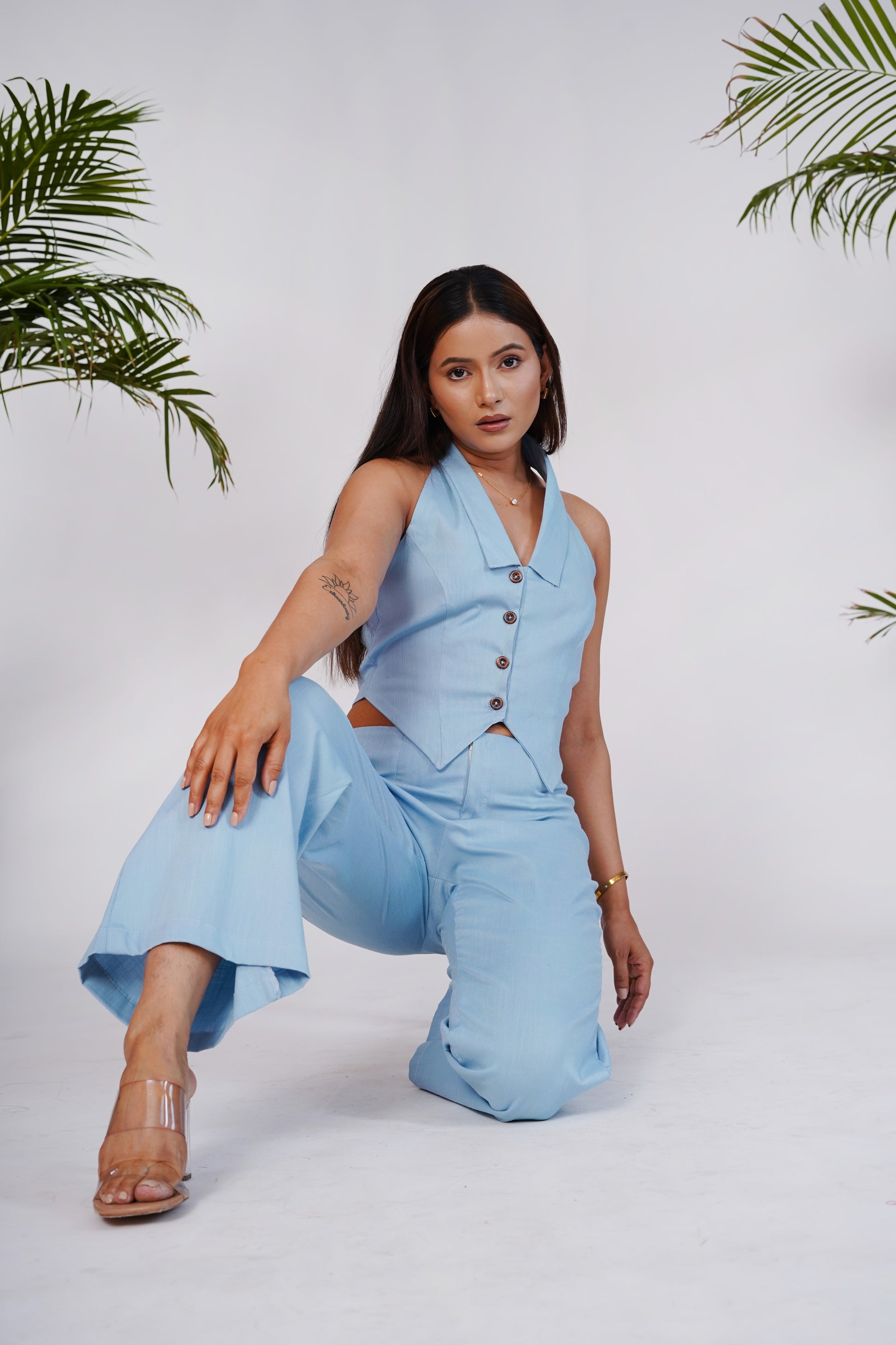 This women's collared waistcoat excudes sophistication and versatility. Made from high quality fabric, it features a classic collar that adds a refined touch to any outfit. The waistcoat design offers a tailored fit that accentuates the waist, creating a polished and elegant silhouette.