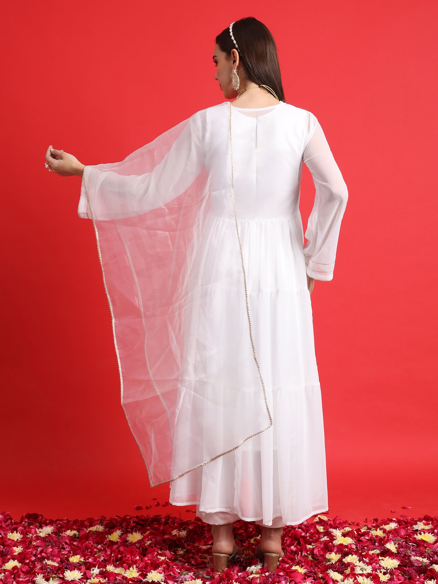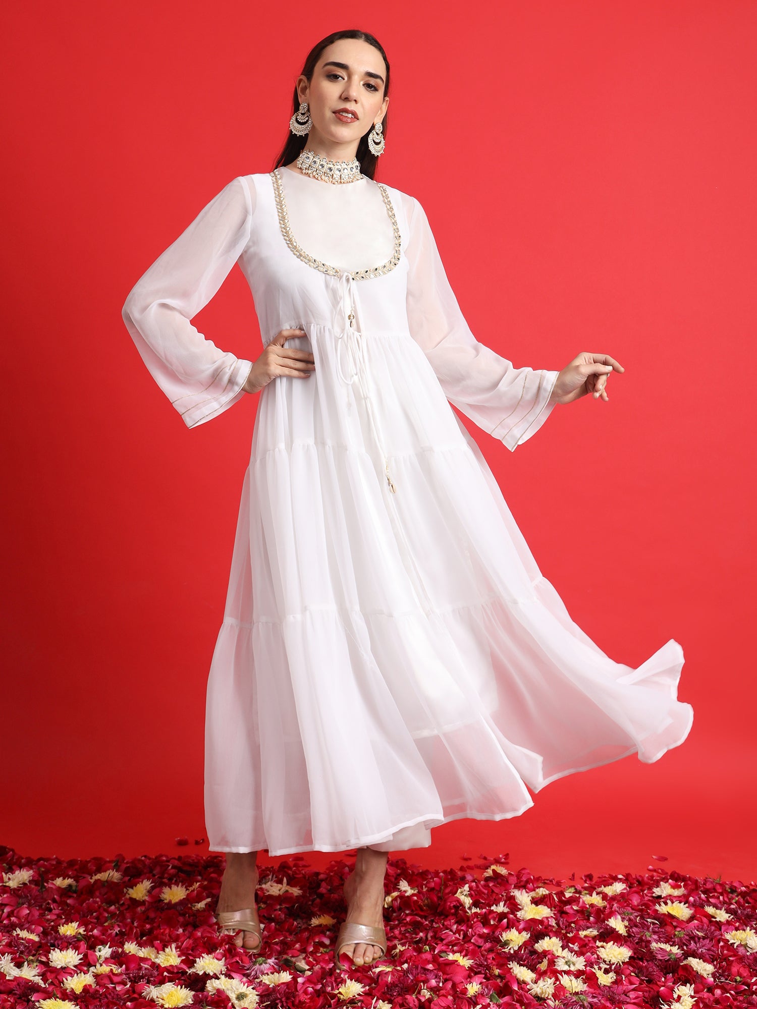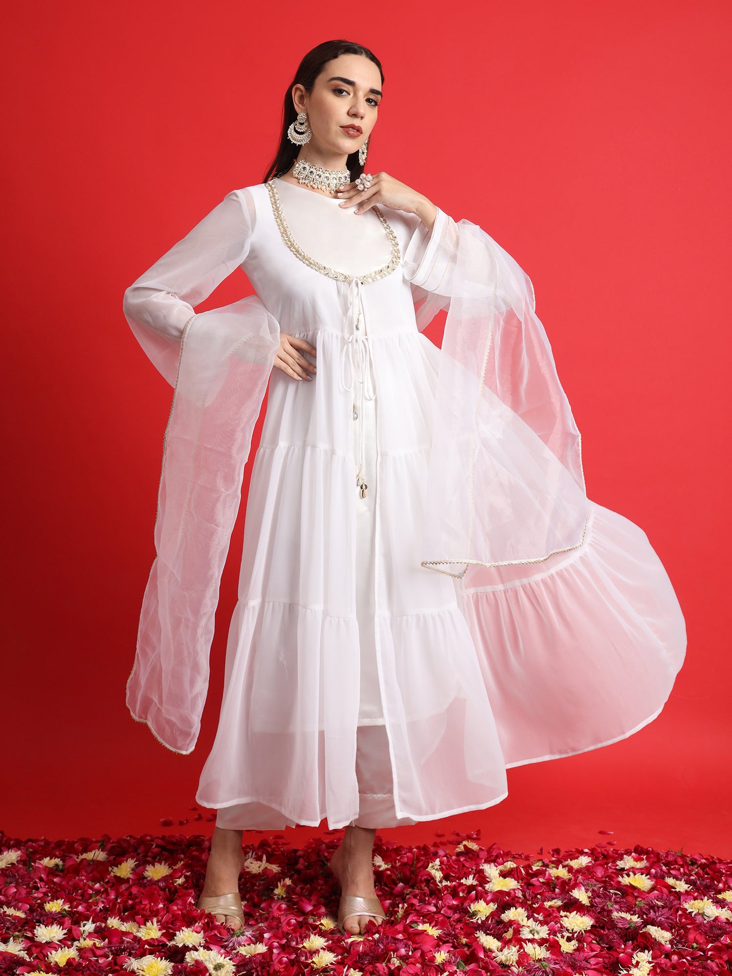 A women's satin kurta set with an embellished georgette layered overlay is an elegant ensemble that blends luxury and style. This kurta set is a perfect balance of traditional and contemporary fashion, ideal for making a refind statement.