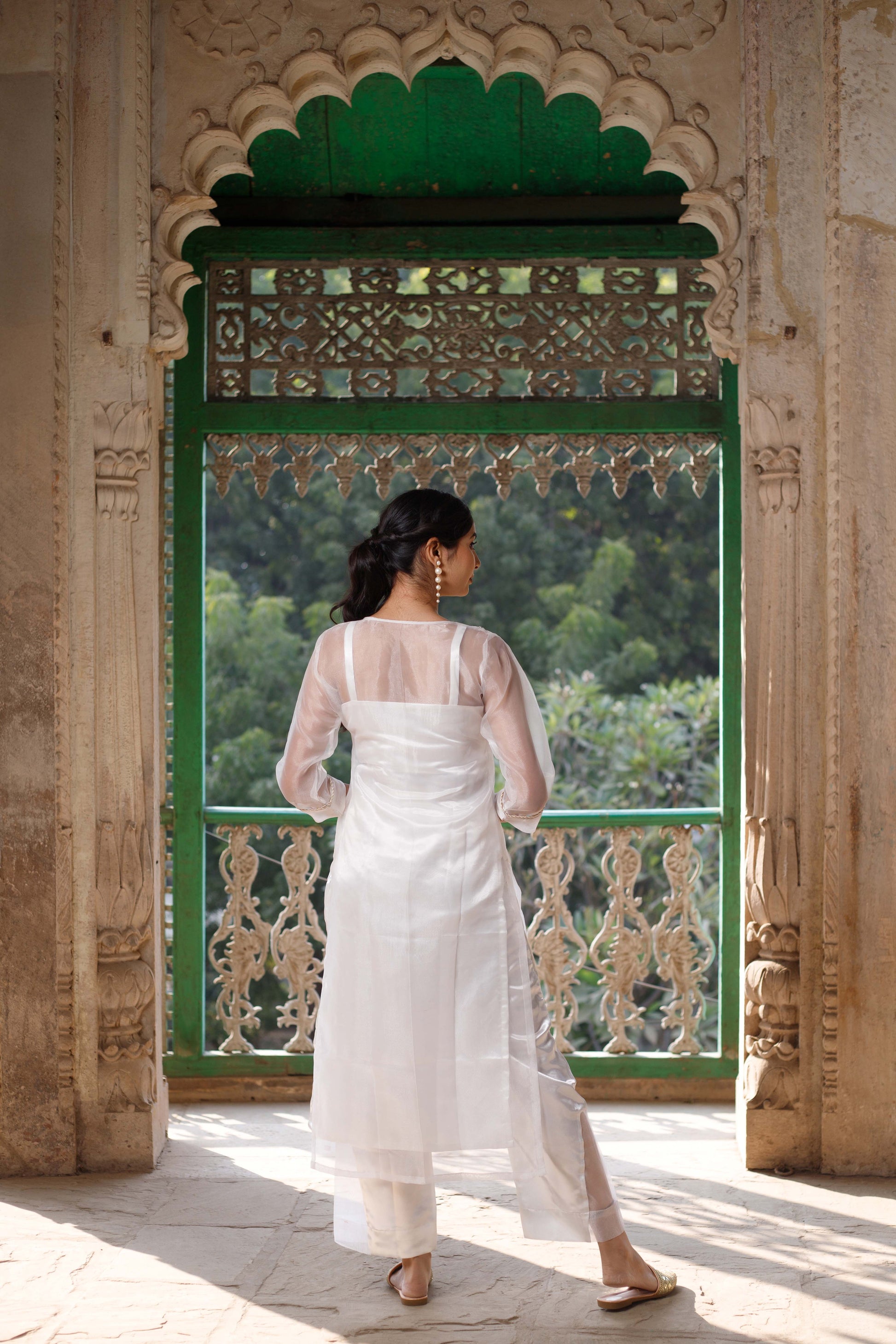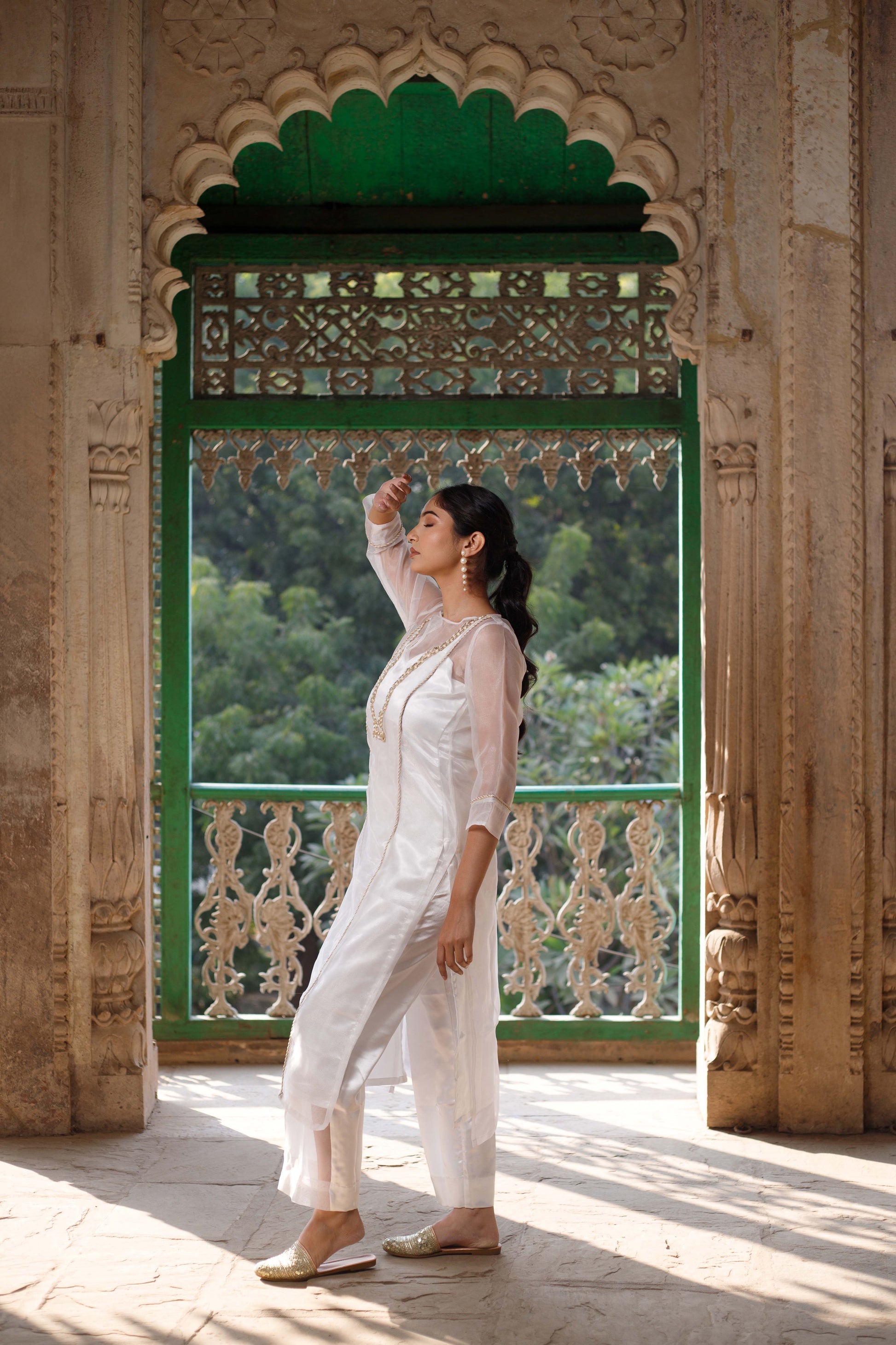 Embrace elegance with this exquisite organza and satin embellished kurta set. The kurta is crafted from sheer organza, adorned with embellishments that add a touch a sophistication. Paired with satin underneath kurta and trousers, the ensemble excudes luxury and grace, making it perfect for festive occasions, weddings, or evening events.